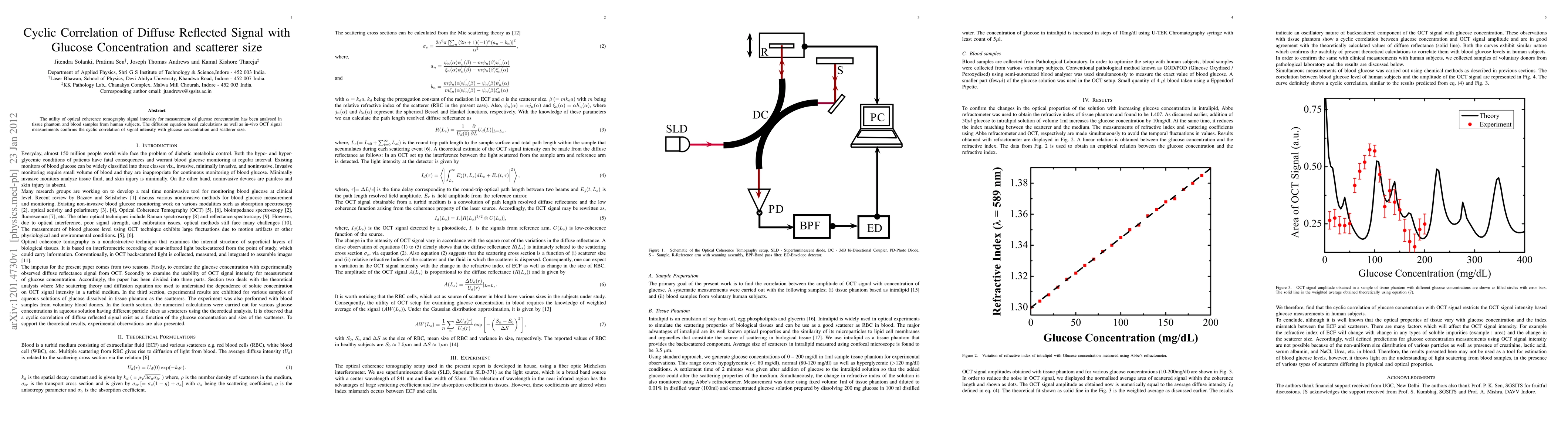 This study investigates the cyclic correlation between optical coherence tomography (OCT) signal intensity and glucose concentration, as well as scatterer size, using tissue phantoms and human blood samples. Results confirm the relationship through diffusion equation calculations and in-vivo OCT signal measurements.