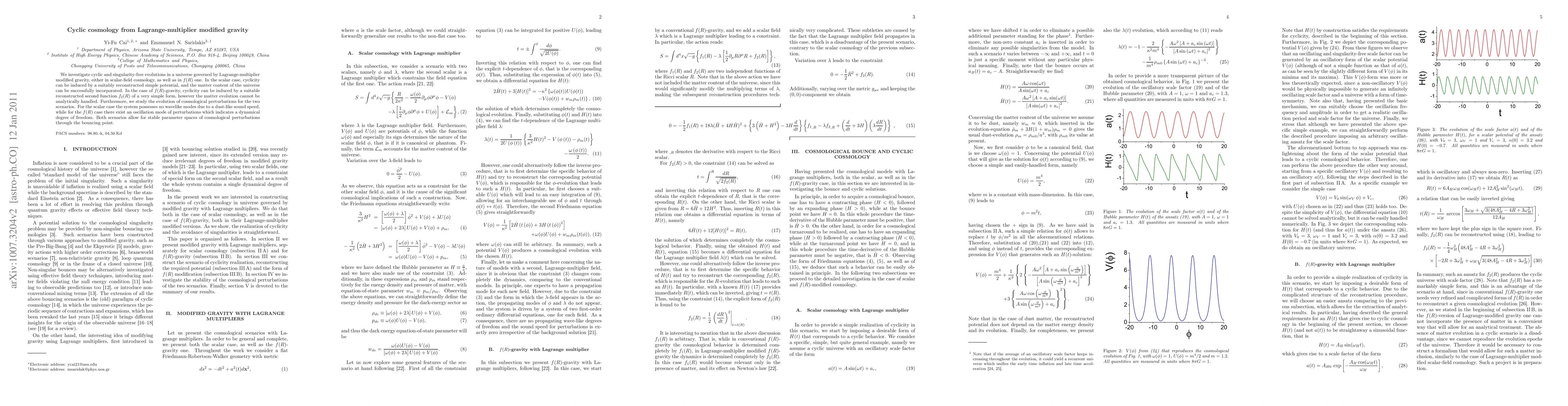 This paper explores cyclic and singularity-free cosmological models using Lagrange-multiplier modified gravity, showing cyclicity in scalar-field and $f(R)$ cosmologies. The scalar case allows for a simple potential and dust-like perturbations, while the $f(R)$ case features a simple $f_2(R)$ function and oscillatory perturbations.
