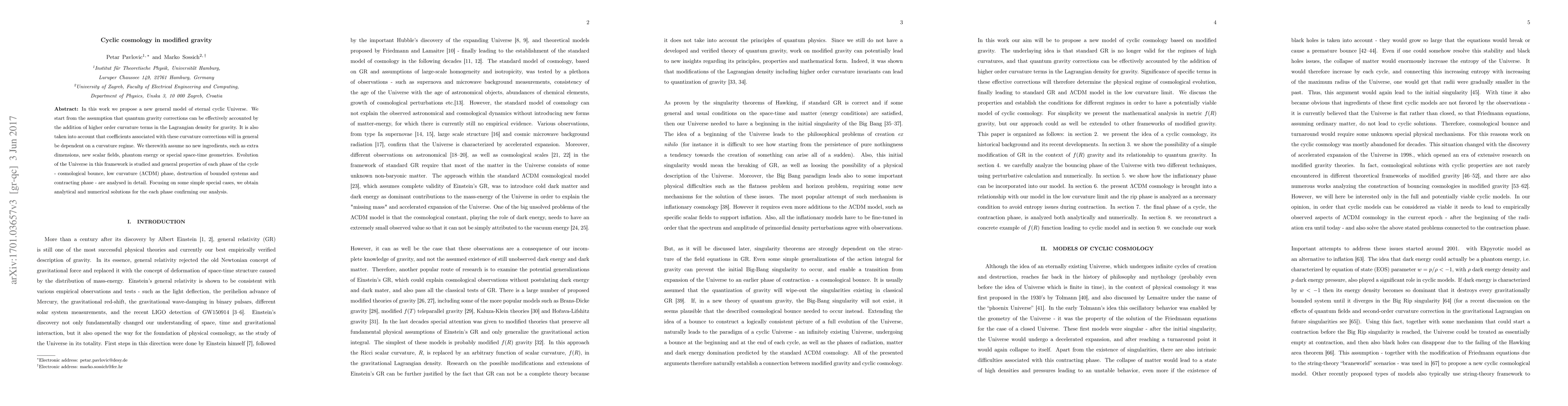 In this work we propose a new general model of eternal cyclic Universe. We start from the assumption that quantum gravity corrections can be effectively accounted by the addition of higher order curvature terms in the Lagrangian density for gravity. It is also taken into account that coefficients associated with these curvature corrections will in general be dependent on a curvature regime. We therewith assume no new ingredients, such as extra dimensions, new scalar fields, phantom energy or special space-time geometries. Evolution of the Universe in this framework is studied and general properties of each phase of the cycle - cosmological bounce, low curvature ($\Lambda$CDM) phase, destruction of bounded systems and contracting phase - are analysed in detail. Focusing on some simple special cases, we obtain analytical and numerical solutions for the each phase confirming our analysis.
