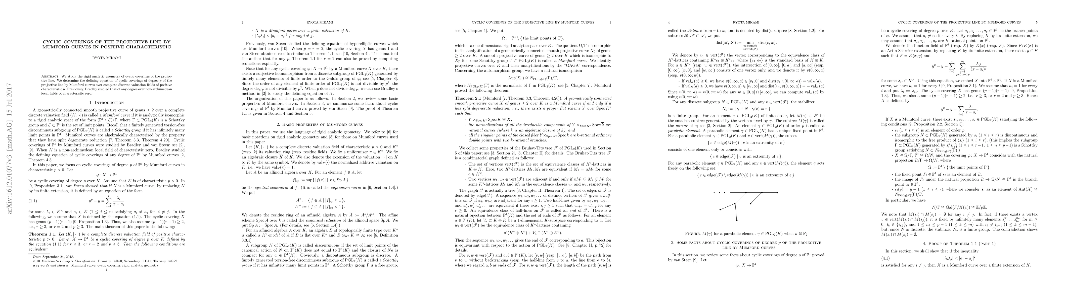 We study the rigid analytic geometry of cyclic coverings of the projective line. We determine the defining equation of a cyclic covering of degree $p$ of the projective line by a Mumford curve over a complete discrete valuation field of positive characteristic $p$. Previously, Bradley studied that of any degree over a non-archimedean local field of characteristic zero.
