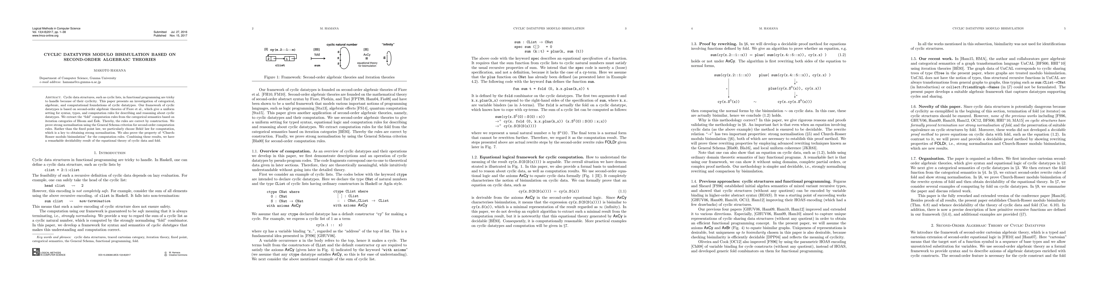 This paper investigates cyclic data structures using second-order algebraic theories, establishing a framework for their syntax, types, and computation rules. It proves strong normalization and Church-Rosser properties, leading to decidability of the equational theory of cyclic data and fold.