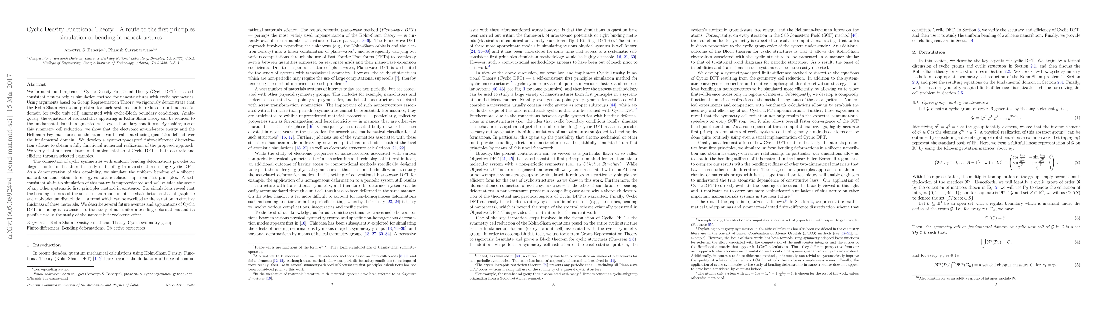 Cyclic Density Functional Theory (Cyclic DFT) is introduced as a first-principles method for simulating bending in nanostructures with cyclic symmetries, utilizing symmetry cell reduction and cyclic-Bloch boundary conditions. The method accurately and efficiently computes the electronic ground-state energy and forces, demonstrated through the first-principles simulation of silicene nanoribbon bending, revealing intermediate bending stiffness.