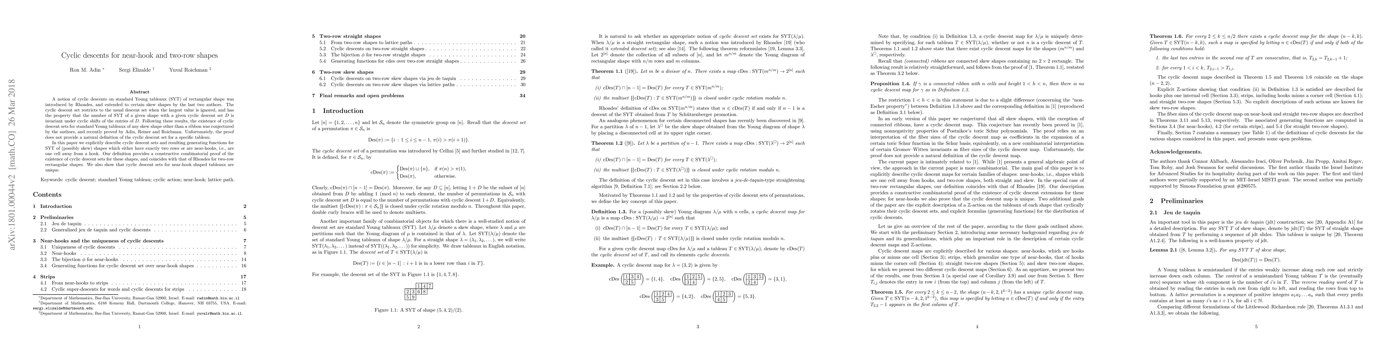 This paper provides an explicit definition of cyclic descent sets for standard Young tableaux of two-row and near-hook shapes, proving their existence and uniqueness for these specific forms. The definition aligns with Rhoades's work for rectangular shapes and yields generating functions for these tableaux.