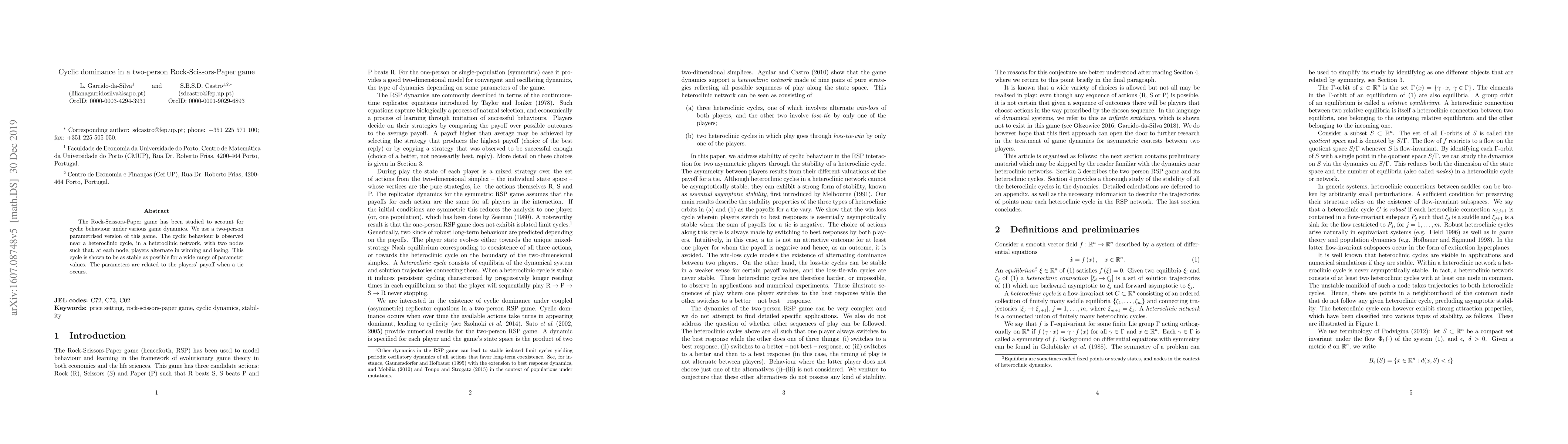 Summary: This study explores a parametrised two-person Rock-Scissors-Paper game where cyclic dominance emerges near a heteroclinic cycle. The cyclic behaviour is stable across a broad range of parameter values, particularly concerning payoffs for ties.