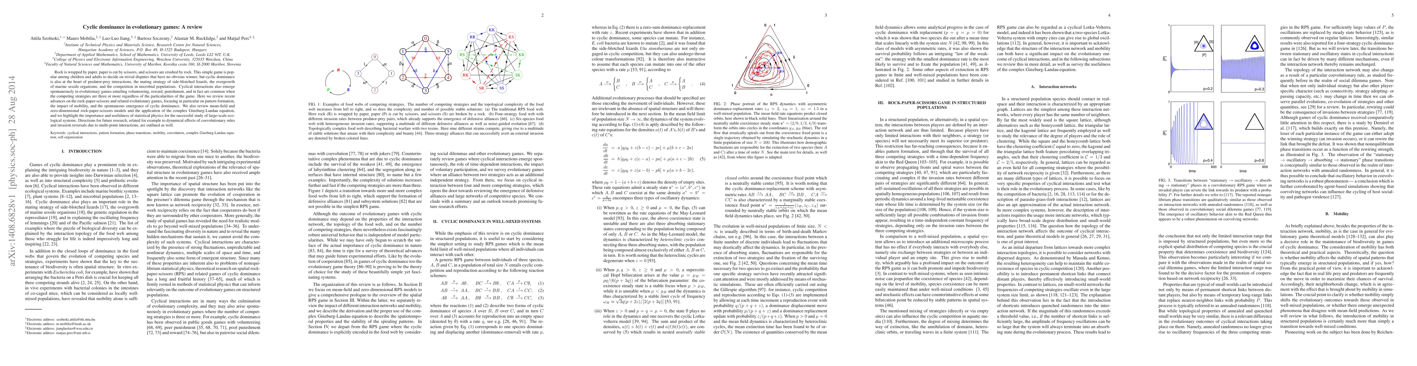 Rock is wrapped by paper, paper is cut by scissors, and scissors are crushed by rock. This simple game is popular among children and adults to decide on trivial disputes that have no obvious winner, but cyclic dominance is also at the heart of predator-prey interactions, the mating strategy of side-blotched lizards, the overgrowth of marine sessile organisms, and the competition in microbial populations. Cyclical interactions also emerge spontaneously in evolutionary games entailing volunteering, reward, punishment, and in fact are common when the competing strategies are three or more regardless of the particularities of the game. Here we review recent advances on the rock-paper-scissors and related evolutionary games, focusing in particular on pattern formation, the impact of mobility, and the spontaneous emergence of cyclic dominance. We also review mean-field and zero-dimensional rock-paper-scissors models and the application of the complex Ginzburg-Landau equation, and we highlight the importance and usefulness of statistical physics for the successful study of large-scale ecological systems. Directions for future research, related for example to dynamical effects of coevolutionary rules and invasion reversals due to multi-point interactions, are outlined as well.