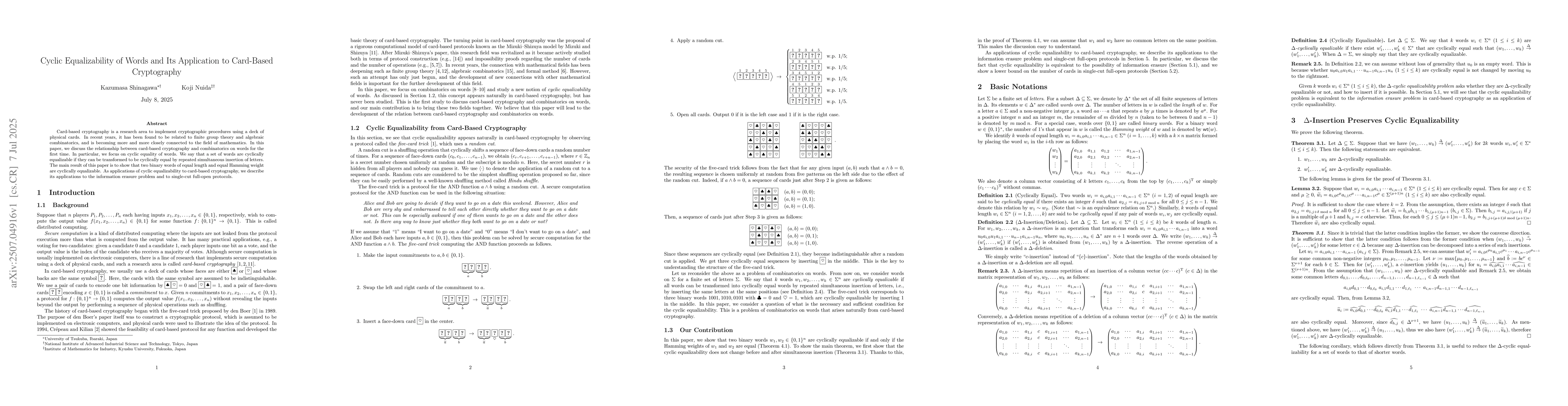 Card-based cryptography is a research area to implement cryptographic procedures using a deck of physical cards. In recent years, it has been found to be related to finite group theory and algebraic combinatorics, and is becoming more and more closely connected to the field of mathematics. In this paper, we discuss the relationship between card-based cryptography and combinatorics on words for the first time. In particular, we focus on cyclic equality of words. We say that a set of words are cyclically equalizable if they can be transformed to be cyclically equal by repeated simultaneous insertion of letters. The main result of this paper is to show that two binary words of equal length and equal Hamming weight are cyclically equalizable. As applications of cyclic equalizability to card-based cryptography, we describe its applications to the information erasure problem and to single-cut full-open protocols.