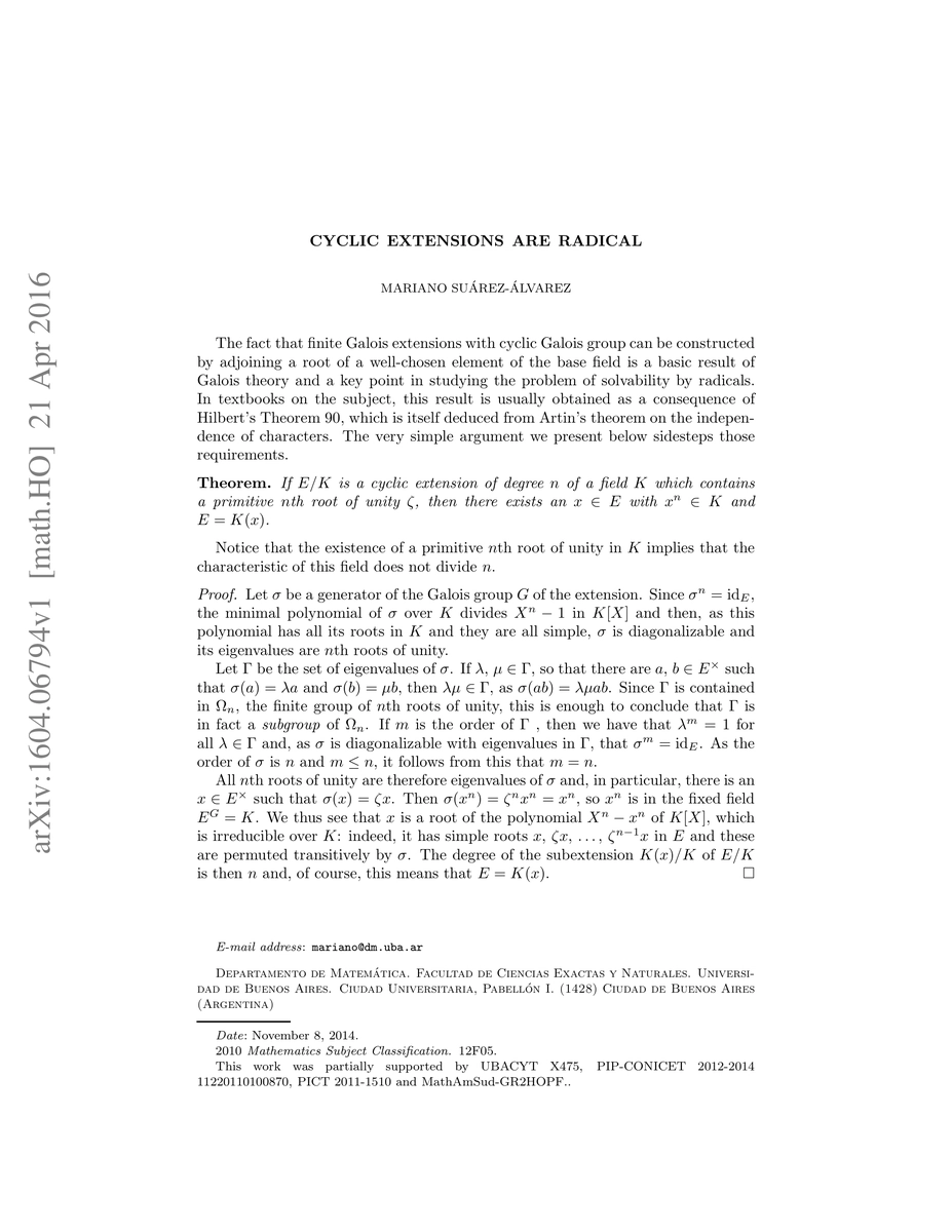 We show that finite Galois extensions with cyclic Galois group are radical.