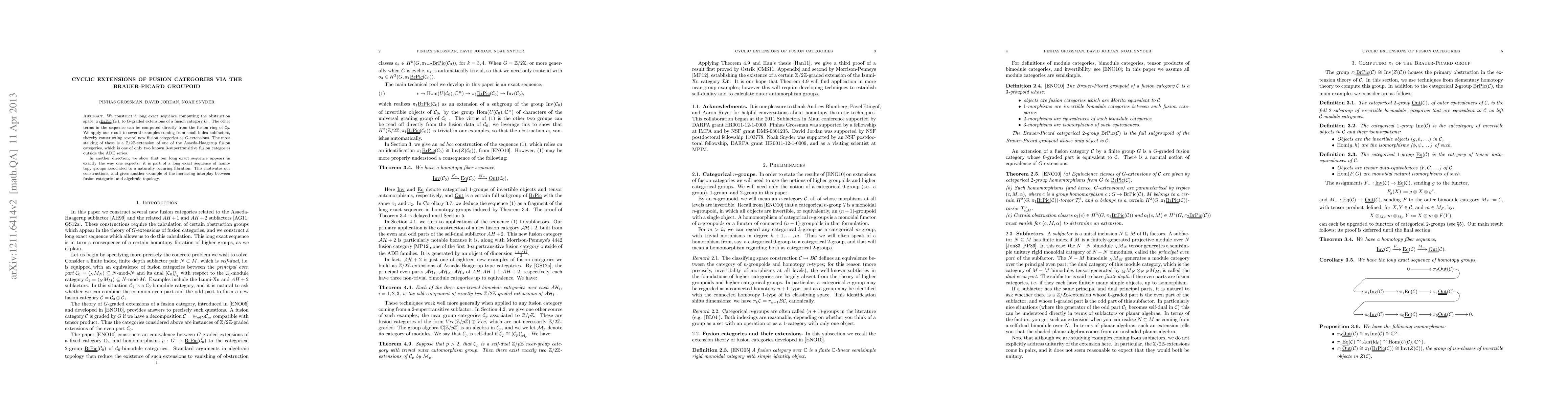 This paper constructs a long exact sequence to compute the obstruction space for G-graded extensions of a fusion category, using the Brauer-Picard groupoid. It applies the sequence to examples from small index subfactors, notably constructing a new Z/2Z-extension of a 3-supertransitive fusion category, and demonstrates the sequence's role in homotopy group sequences, highlighting the connection between fusion categories and algebraic topology.