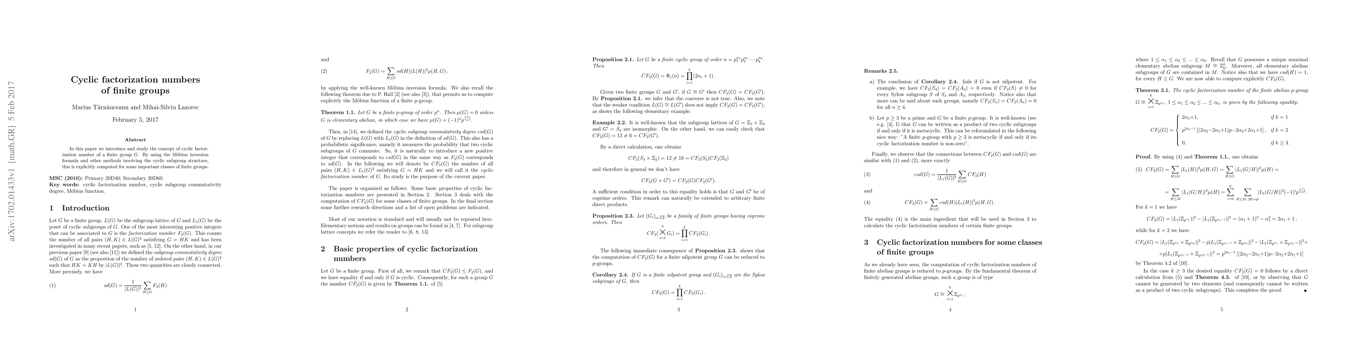 This paper introduces the cyclic factorization number of a finite group G and computes it explicitly for important classes of finite groups using the Möbius inversion formula and analysis of cyclic subgroup structures.