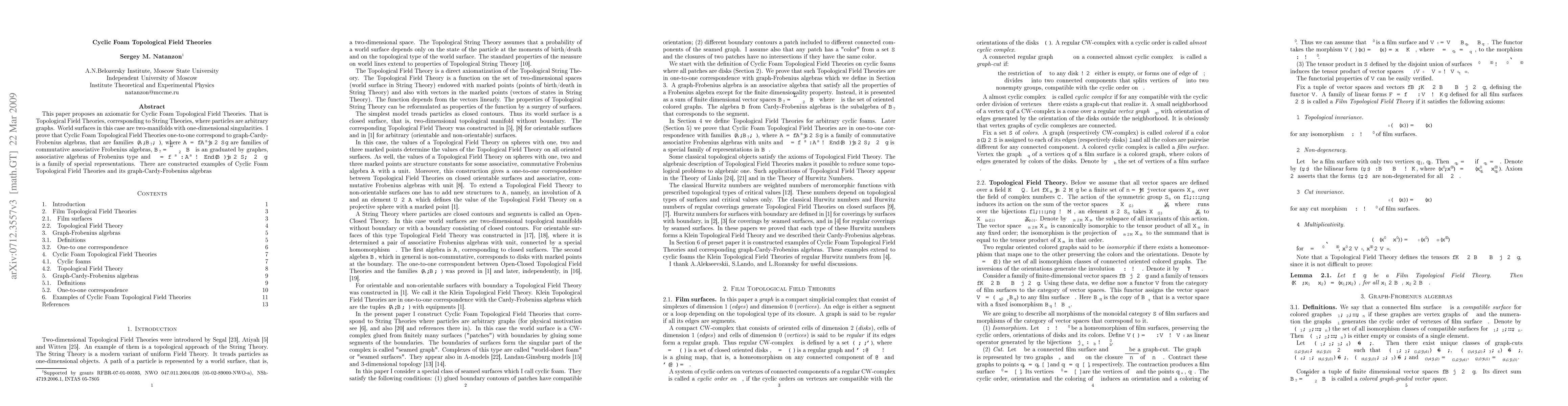 This paper proposes an axiomatic for Cyclic Foam Topological Field theories. That is Topological Field theories, corresponding to String theories, where particles are arbitrary graphs. World surfaces in this case are two-manifolds with one-dimensional singularities. We proved that Cyclic Foam Topological Field theories one-to-one correspond to graph-Cardy-Frobenius algebras, that are families $(A,B_\star,\phi)$, where $A=\{A^s|s\in S\}$ are families of commutative associative Frobenius algebras, $B_\star = \bigoplus_{\sigma\in\Sigma} B_\sigma$ is an graduated by graphes, associative algebras of Frobenius type and $\phi=\{\phi_\sigma^s: A^s\to (B_\sigma)|s\in S,\sigma\in \Sigma\}$ is a family of special representations. There are constructed examples of Cyclic Foam Topological Field theories and its graph-Cardy-Frobenius algebras