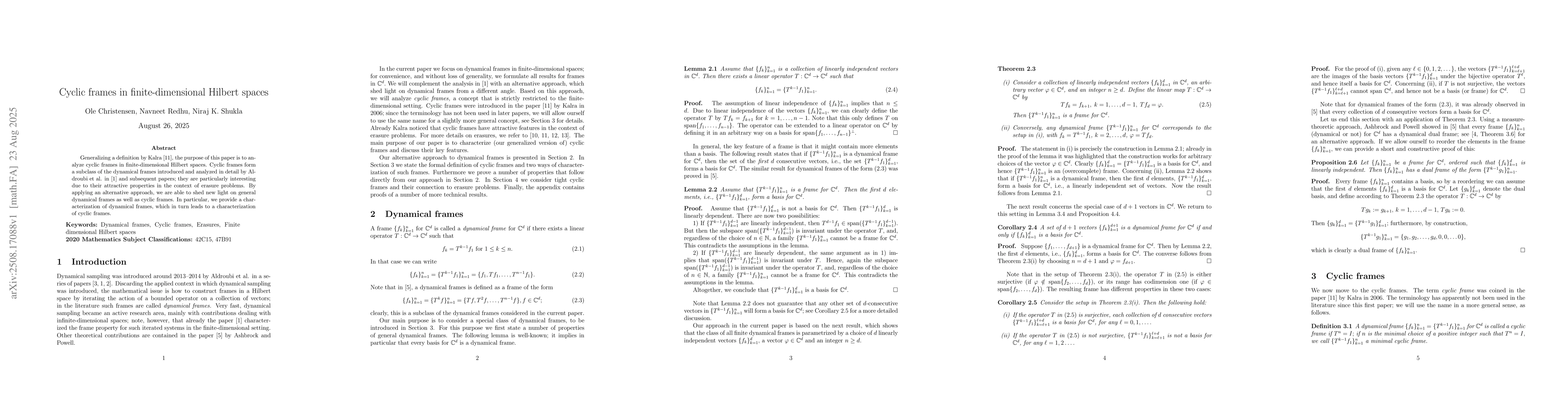 Generalizing a definition by Kalra \cite{Kalra}, the purpose of this paper is to analyze cyclic frames in finite-dimensional Hilbert spaces. Cyclic frames form a subclass of the dynamical frames introduced and analyzed in detail by Aldroubi et al. in \cite{ACM} and subsequent papers; they are particularly interesting due to their attractive properties in the context of erasure problems. By applying an alternative approach, we are able to shed new light on general dynamical frames as well as cyclic frames. In particular, we provide a characterization of dynamical frames, which in turn leads to a characterization of cyclic frames.