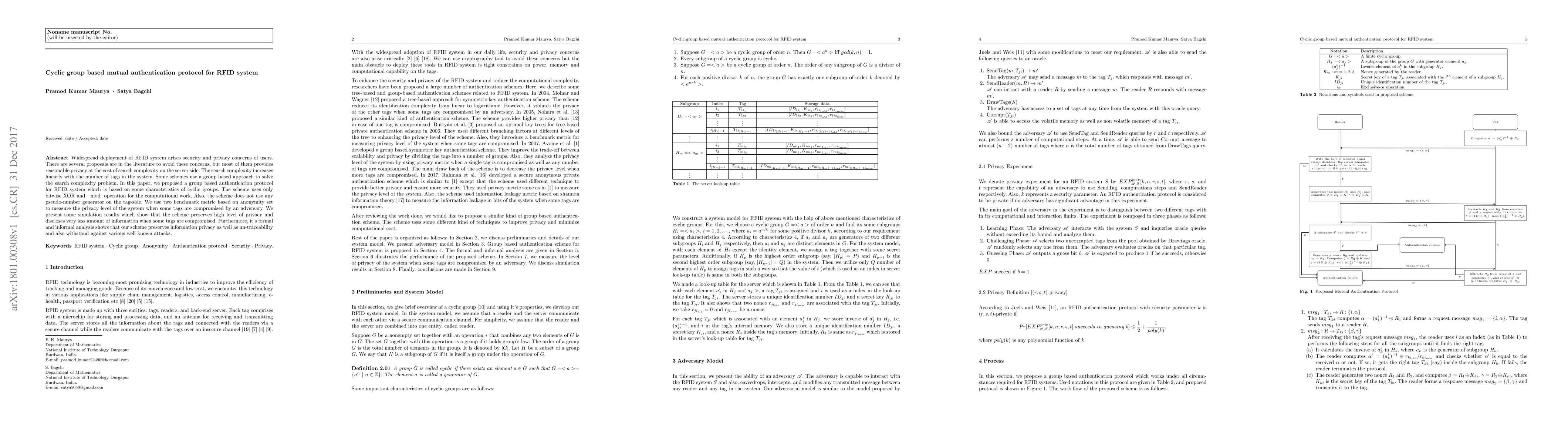 The main technical contribution is a cyclic group-based mutual authentication protocol for RFID systems that ensures privacy and security with minimal computational overhead on tags.