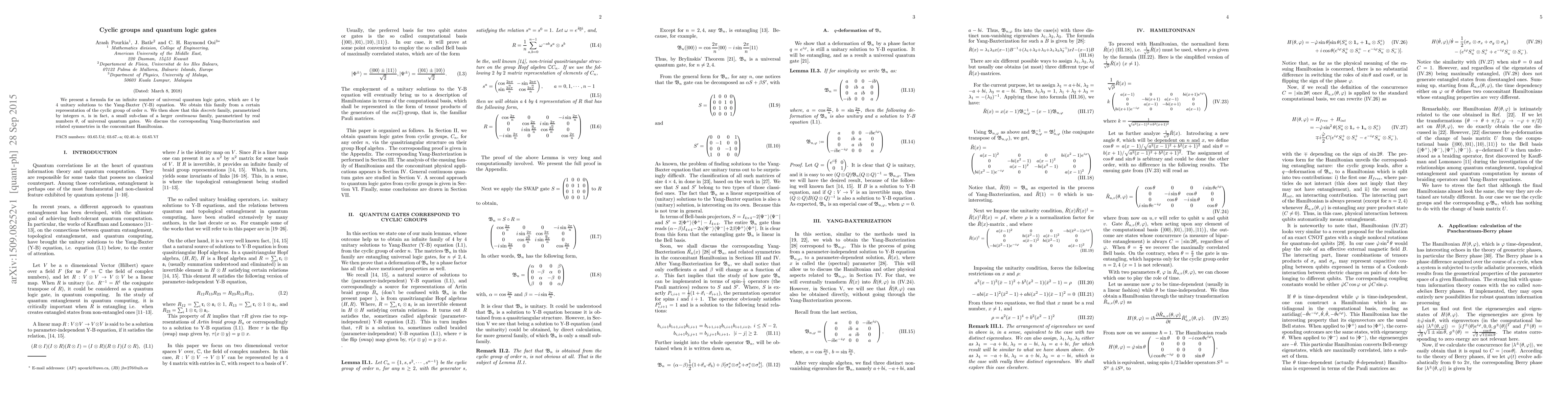 This paper introduces a formula for an infinite set of universal quantum logic gates derived from cyclic group representations, showing that these gates form a discrete subset of a larger continuous family. The study also explores the associated Yang-Baxter equation and symmetries in the corresponding Hamiltonian.