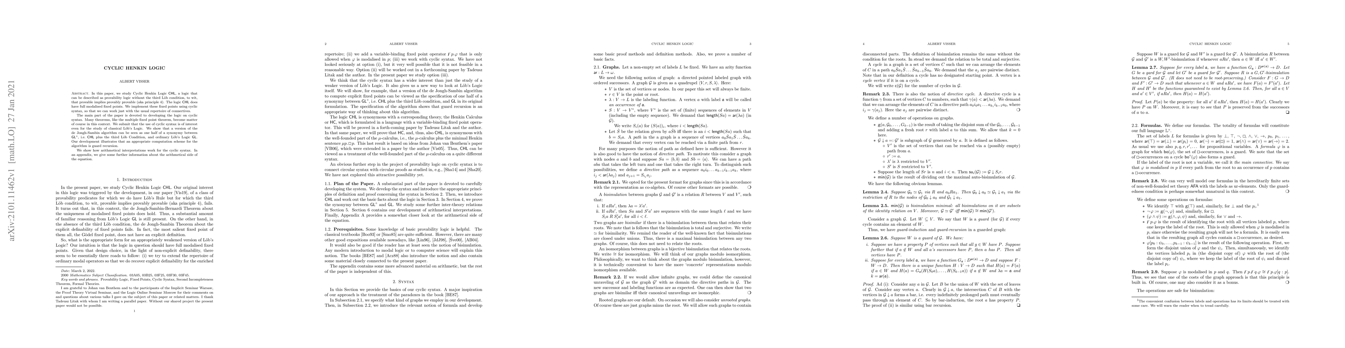 In this paper, we study Cyclic Henkin Logic CHL, a logic that can be described as provability logic without the third L\"ob condition, to wit, that provable implies provably provable (aka principle 4). The logic CHL does have full modalised fixed points. We implement these fixed points using cyclic syntax, so that we can work just with the usual repertoire of connectives. The main part of the paper is devoted to developing the logic on cyclic syntax. Many theorems, like the multiple fixed point theorem, become matter of course in this context. We submit that the use of cyclic syntax is of interest even for the study of classical L\"ob's Logic. We show that a version of the de Jongh-Sambin algorithm can be seen as one half of a synonymy between the theory GL^\circ, i.e.\ CHL plus the third L\"ob Condition, and ordinary L\"ob's Logic GL. Our development illustrates that an appropriate computation scheme for the algorithm is guard recursion. We show how arithmetical interpretations work for the cyclic syntax. In an appendix, we give some further information about the arithmetical side of the equation.
