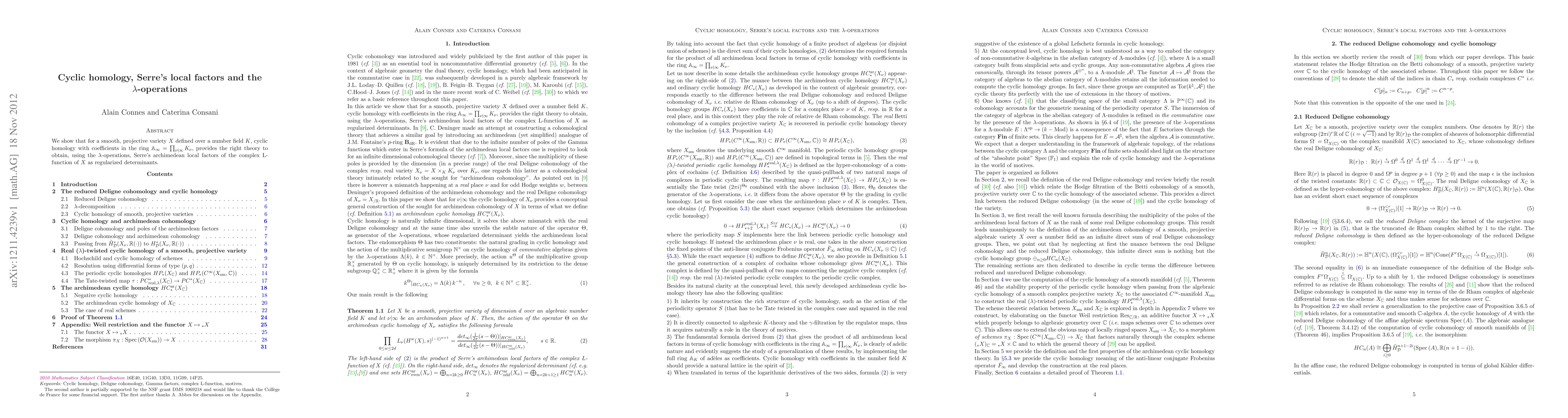 Summary: The paper demonstrates that cyclic homology with adele coefficients for a smooth projective variety over a number field yields Serre's archimedean local factors of the complex L-function through regularized determinants via lambda-operations. This establishes cyclic homology as a suitable framework for understanding these local factors.