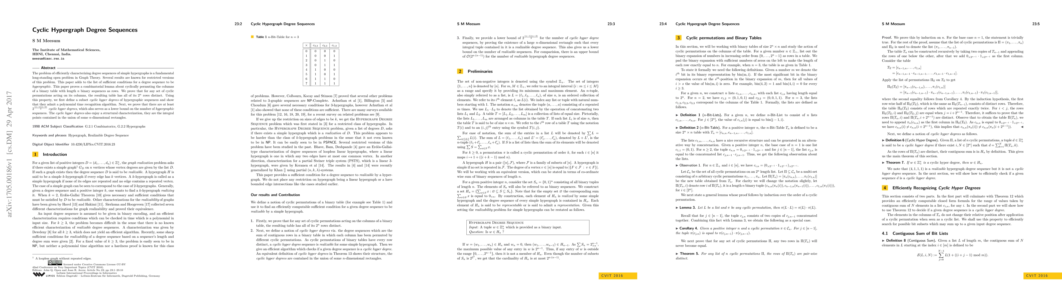 The problem of efficiently characterizing degree sequences of simple hypergraphs is a fundamental long-standing open problem in Graph Theory. Several results are known for restricted versions of this problem. This paper adds to the list of sufficient conditions for a degree sequence to be {\em hypergraphic}. This paper proves a combinatorial lemma about cyclically permuting the columns of a binary table with length $n$ binary sequences as rows. We prove that for any set of cyclic permutations acting on its columns, the resulting table has all of its $2^n$ rows distinct. Using this property, we first define a subset {\em cyclic hyper degrees} of hypergraphic sequences and show that they admit a polynomial time recognition algorithm. Next, we prove that there are at least $2^{\frac{(n-1)(n-2)}{2}}$ {\em cyclic hyper degrees}, which also serves as a lower bound on the number of {\em hypergraphic} sequences. The {\em cyclic hyper degrees} also enjoy a structural characterization, they are the integral points contained in the union of some $n$-dimensional rectangles.