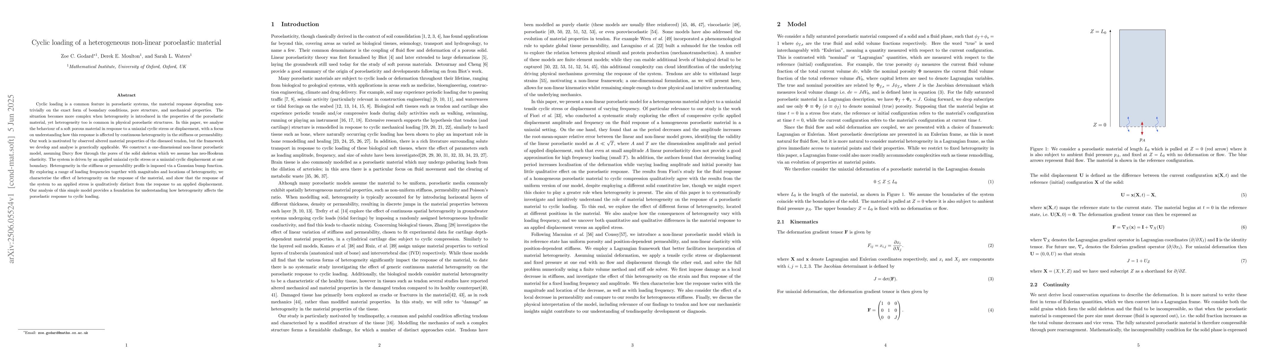 Cyclic loading is a common feature in poroelastic systems, the material response depending non-trivially on the exact form of boundary conditions, pore structure, and mechanical properties. The situation becomes more complex when heterogeneity is introduced in the properties of the poroelastic material, yet heterogeneity too is common in physical poroelastic structures. In this paper, we analyse the behaviour of a soft porous material in response to a uniaxial cyclic stress or displacement, with a focus on understanding how this response is affected by continuous heterogeneity in the stiffness or permeability. Our work is motivated by observed altered material properties of the diseased tendon, but the framework we develop and analyse is generically applicable. We construct a one-dimensional non-linear poroelastic model, assuming Darcy flow through the pores of the solid skeleton which we assume has neo-Hookean elasticity. The system is driven by an applied uniaxial cyclic stress or a uniaxial cyclic displacement at one boundary. Heterogeneity in the stiffness or permeability profile is imposed via a Gaussian bump function. By exploring a range of loading frequencies together with magnitudes and locations of heterogeneity, we characterise the effect of heterogeneity on the response of the material, and show that the response of the system to an applied stress is qualitatively distinct from the response to an applied displacement. Our analysis of this simple model provides a foundation for understanding how heterogeneity affects the poroelastic response to cyclic loading.