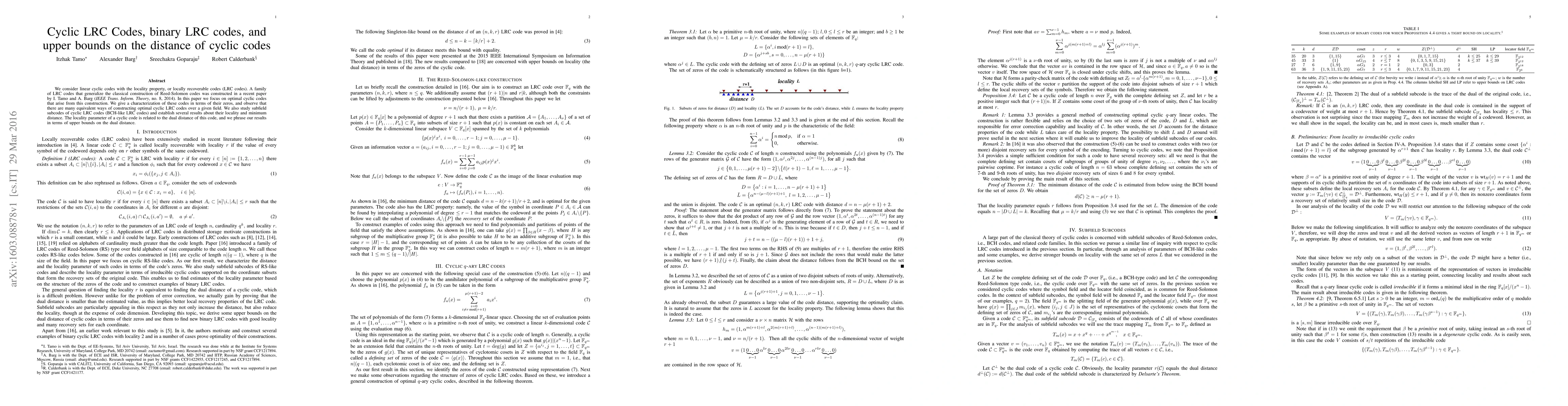 We consider linear cyclic codes with the locality property, or locally recoverable codes (LRC codes). A family of LRC codes that generalize the classical construction of Reed-Solomon codes was constructed in a recent paper by I. Tamo and A. Barg (IEEE Trans. Inform. Theory, no. 8, 2014). In this paper we focus on optimal cyclic codes that arise from this construction. We give a characterization of these codes in terms of their zeros, and observe that there are many equivalent ways of constructing optimal cyclic LRC codes over a given field. We also study subfield subcodes of cyclic LRC codes (BCH-like LRC codes) and establish several results about their locality and minimum distance. The locality parameter of a cyclic code is related to the dual distance of this code, and we phrase our results in terms of upper bounds on the dual distance.