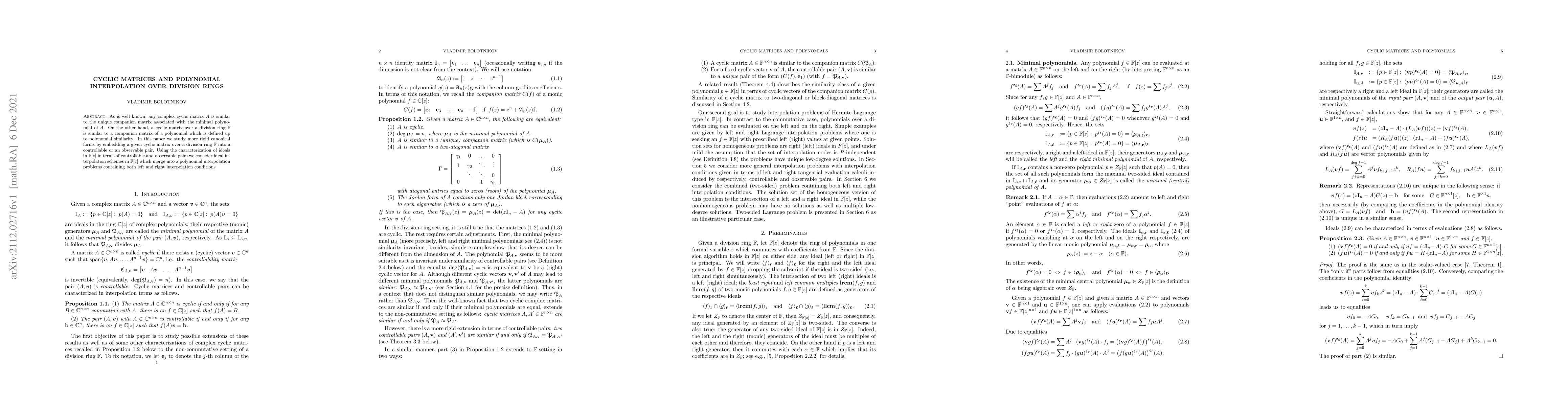 Researchers explore rigid canonical forms of cyclic matrices over division rings, focusing on polynomial interpolation problems with both left and right conditions, enabling ideal interpolation schemes in $oldsymbol{}[z]$.