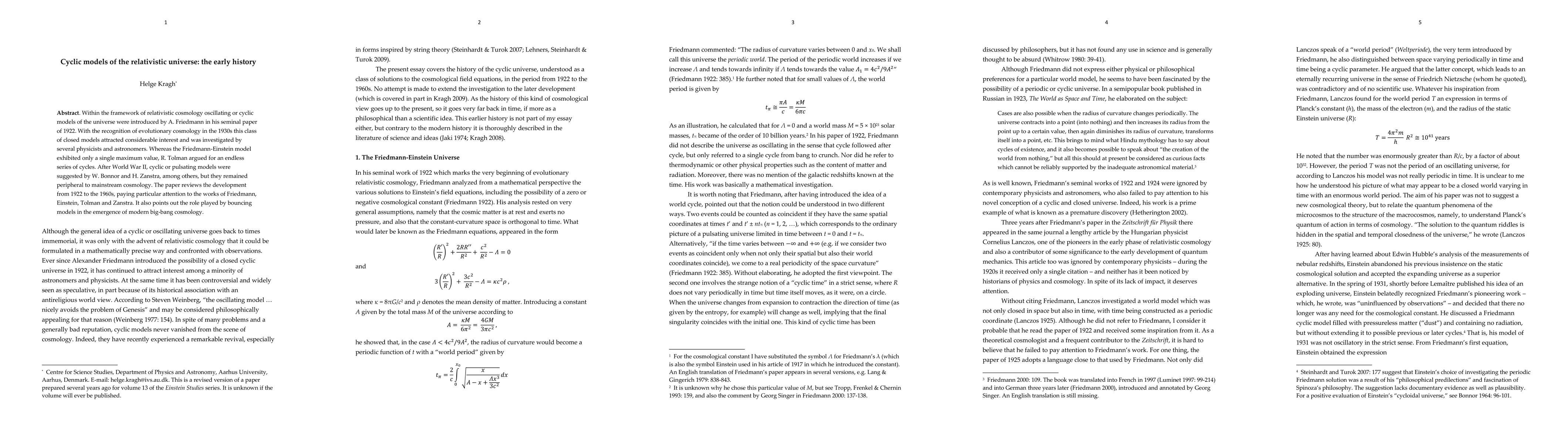 Within the framework of relativistic cosmology oscillating or cyclic models of the universe were introduced by A. Friedmann in his seminal paper of 1922. With the recognition of evolutionary cosmology in the 1930s this class of closed models attracted considerable interest and was investigated by several physicists and astronomers. Whereas the Friedmann-Einstein model exhibited only a single maximum value, R. Tolman argued for an endless series of cycles. After World War II, cyclic or pulsating models were suggested by W. Bonnor and H. Zanstra, among others, but they remained peripheral to mainstream cosmology. The paper reviews the development from 1922 to the 1960s, paying particular attention to the works of Friedmann, Einstein, Tolman and Zanstra. It also points out the role played by bouncing models in the emergence of modern big-bang cosmology.