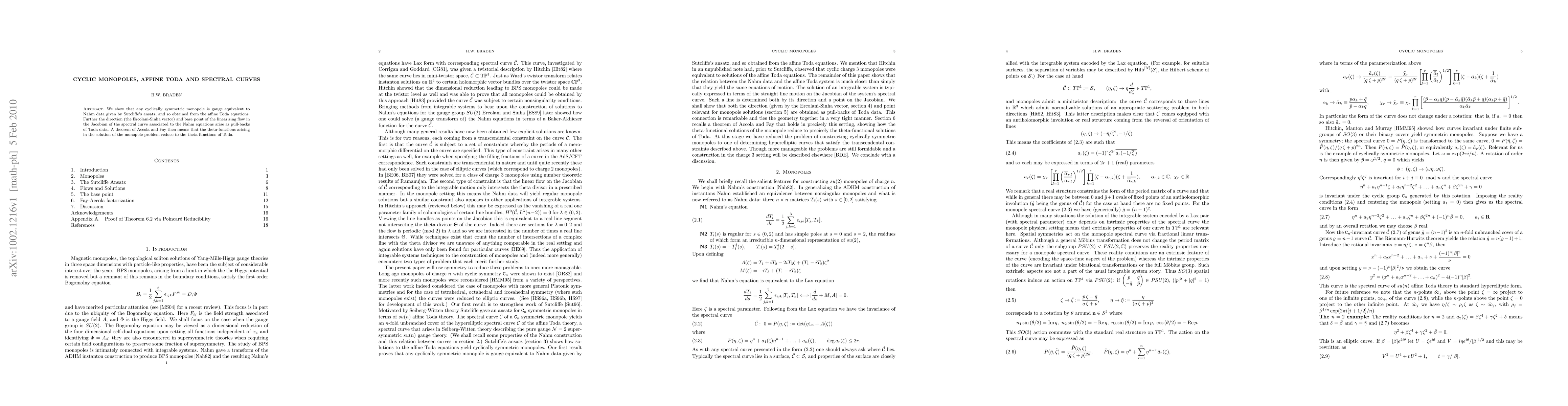 We show that any cyclically symmetric monopole is gauge equivalent to Nahm data given by Sutcliffe's ansatz, and so obtained from the affine Toda equations. Further the direction (the Ercolani-Sinha vector) and base point of the linearising flow in the Jacobian of the spectral curve associated to the Nahm equations arise as pull-backs of Toda data. A theorem of Accola and Fay then means that the theta-functions arising in the solution of the monopole problem reduce to the theta-functions of Toda.