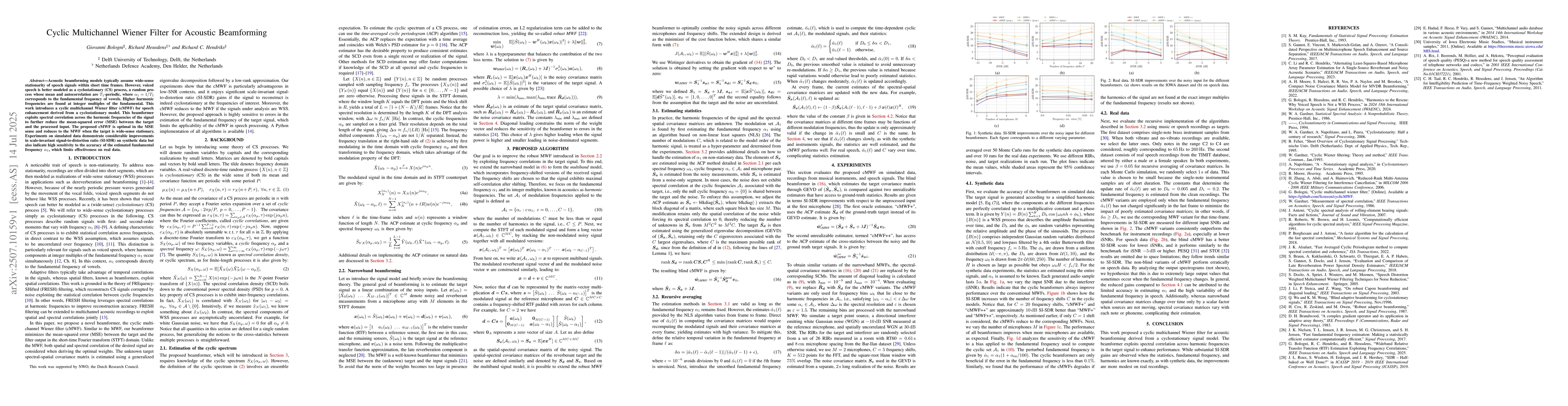 Acoustic beamforming models typically assume wide-sense stationarity of speech signals within short time frames. However, voiced speech is better modeled as a cyclostationary (CS) process, a random process whose mean and autocorrelation are $T_1$-periodic, where $\alpha_1=1/T_1$ corresponds to the fundamental frequency of vowels. Higher harmonic frequencies are found at integer multiples of the fundamental. This work introduces a cyclic multichannel Wiener filter (cMWF) for speech enhancement derived from a cyclostationary model. This beamformer exploits spectral correlation across the harmonic frequencies of the signal to further reduce the mean-squared error (MSE) between the target and the processed input. The proposed cMWF is optimal in the MSE sense and reduces to the MWF when the target is wide-sense stationary. Experiments on simulated data demonstrate considerable improvements in scale-invariant signal-to-distortion ratio (SI-SDR) on synthetic data but also indicate high sensitivity to the accuracy of the estimated fundamental frequency $\alpha_1$, which limits effectiveness on real data.