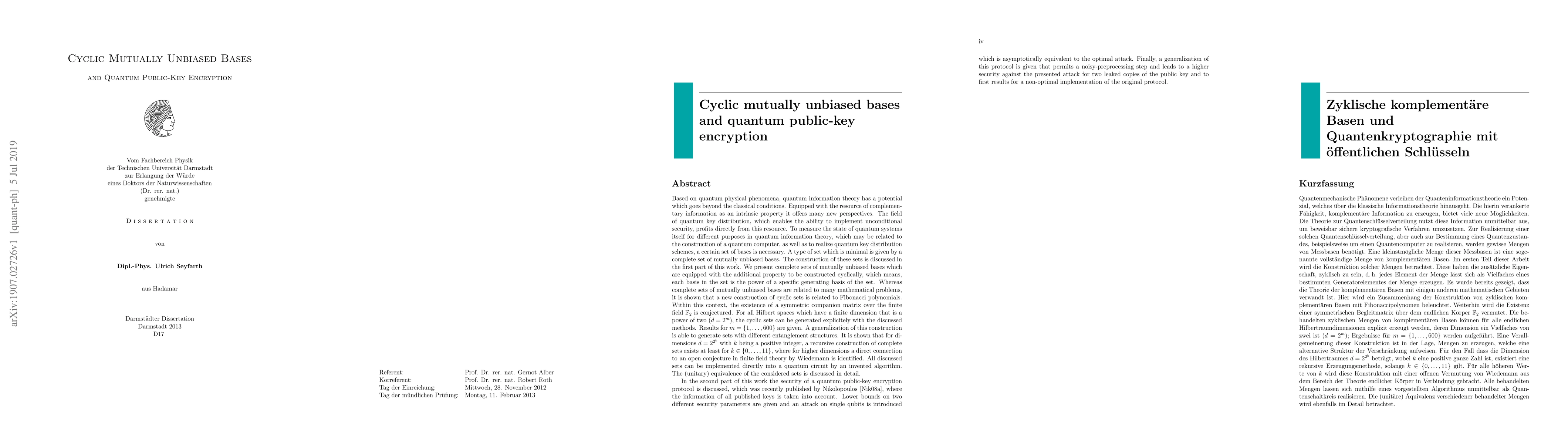 This research presents a recursive construction for cyclic mutually unbiased bases in Fermat number dimensions, linked to Wiedemann's conjecture for high-qubit systems. It also examines a quantum public-key encryption scheme.