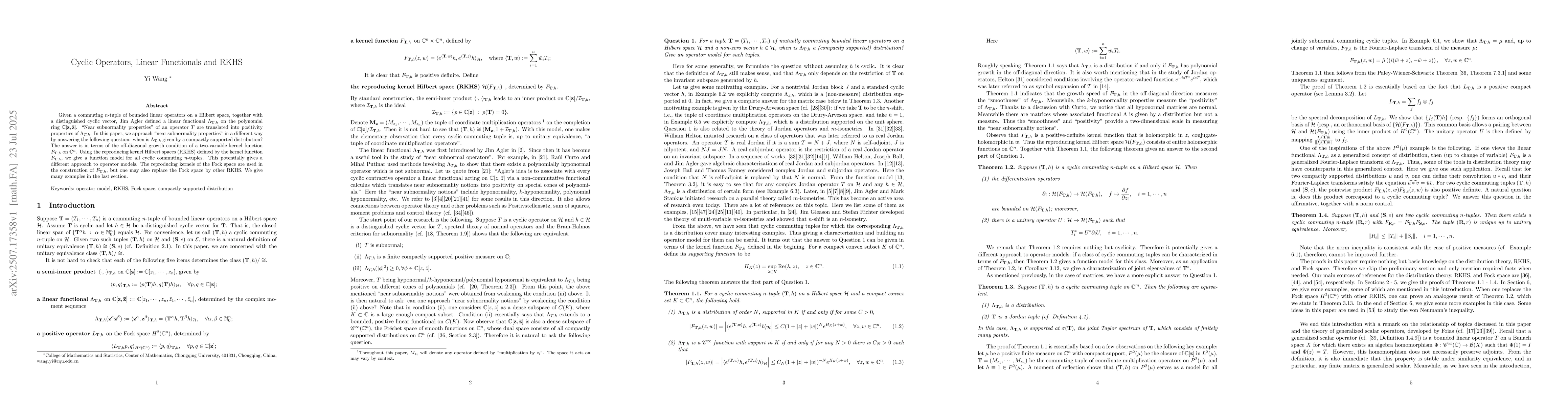Given a commuting $n$-tuple of bounded linear operators on a Hilbert space, together with a distinguished cyclic vector, Jim Agler defined a linear functional $\Lambda_{\mathbf{T},h}$ on the polynomial ring $\mathbb{C}[\mathbf{z},\bar{\mathbf{z}}]$. ``Near subnormality properties'' of an operator $T$ are translated into positivity properties of $\Lambda_{T,h}$. In this paper, we approach ``near subnormality properties'' in a different way by answering the following question: when is $\Lambda_{\mathbf{T},h}$ given by a compactly supported distribution? The answer is in terms of the off-diagonal growth condition of a two-variable kernel function $F_{\mathbf{T},h}$ on $\mathbb{C}^n$. Using the reproducing kernel Hilbert spaces (RKHS) defined by the kernel function $F_{\mathbf{T},h}$, we give a function model for all cyclic commuting $n$-tuples. This potentially gives a different approach to operator models. The reproducing kernels of the Fock space are used in the construction of $F_{\mathbf{T},h}$, but one may also replace the Fock space by other RKHS. We give many examples in the last section.