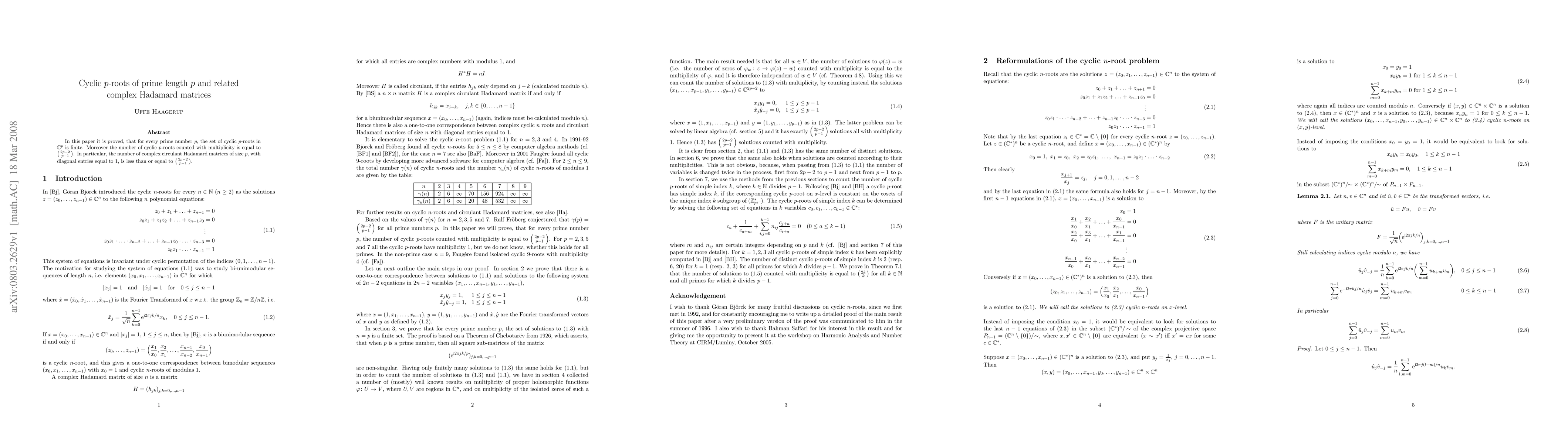 Research proves that the number of cyclic p-roots in C^p is finite and equal to (2p-2)!/(p-1)!^2 for prime numbers p, with implications for complex Hadamard matrices of size p.