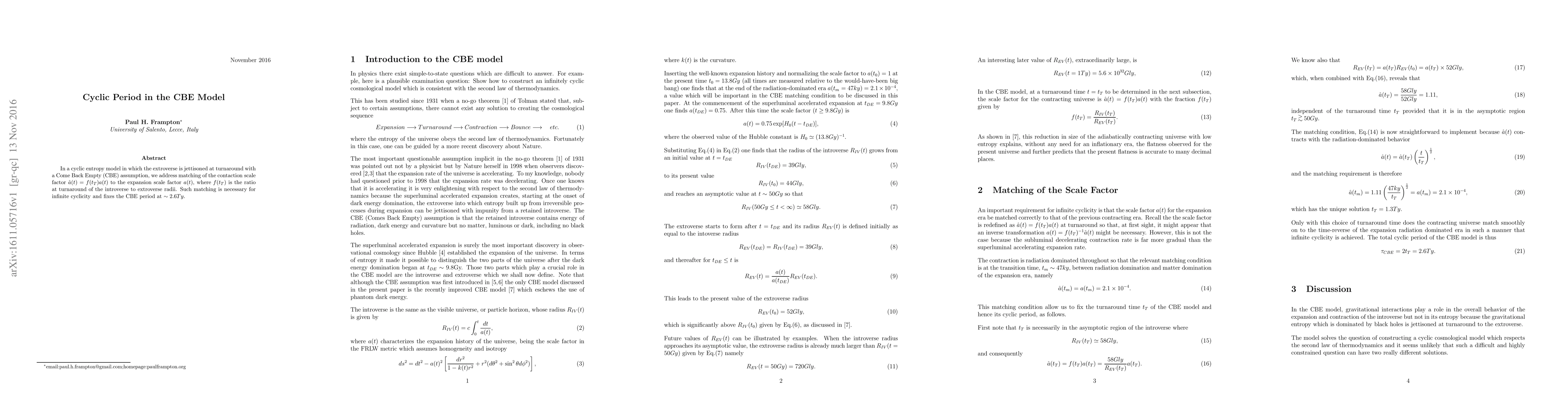 This paper explores the cyclic entropy model with a Come Back Empty (CBE) assumption, focusing on matching the contaction scale factor to the expansion scale factor to achieve infinite cyclicity, determining the CBE period to be approximately 2.6 trillion years.