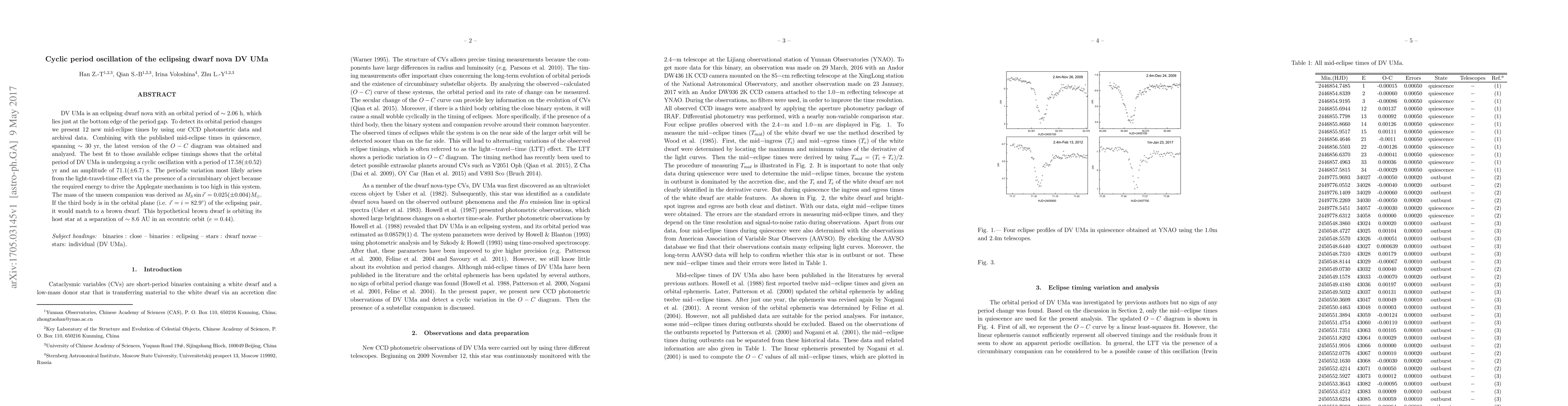 DV UMa, an eclipsing dwarf nova near the period gap, exhibits cyclic orbital period oscillations detected through new and archival mid-eclipse times. The oscillations, with a period of 17.58 years and an amplitude of 71.1 s, likely arise from a circumbinary object, suggesting a brown dwarf companion in an eccentric orbit.