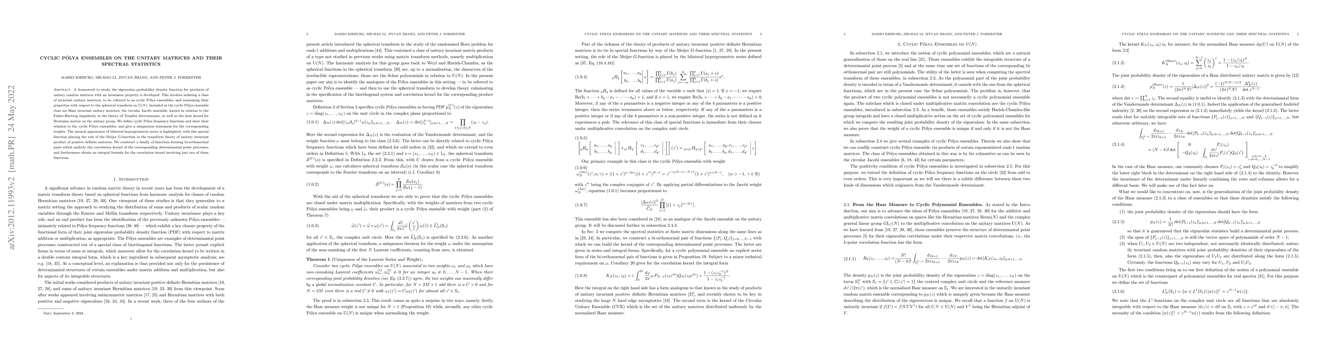 Summary: This paper extends the framework of spherical transforms and Pólya ensembles to study products of unitary matrices, defining cyclic Pólya frequency functions and analyzing their eigenvalue statistics, and outlining challenges in investigating local spectral statistics.