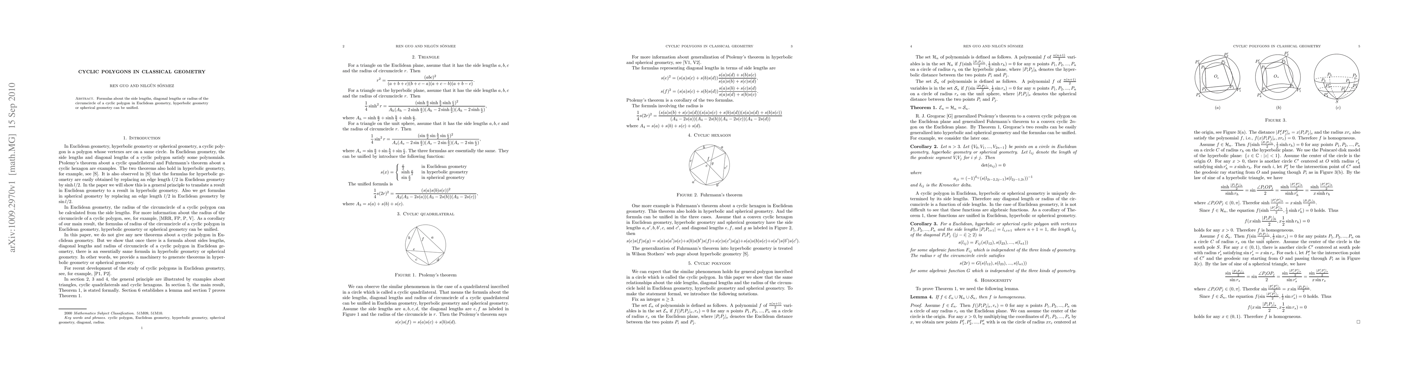 Summary: This paper unifies formulas for side lengths, diagonal lengths, and circumcircle radius across cyclic polygons in Euclidean, hyperbolic, and spherical geometries. The research provides a comprehensive approach to understanding cyclic polygons in various classical geometric settings.