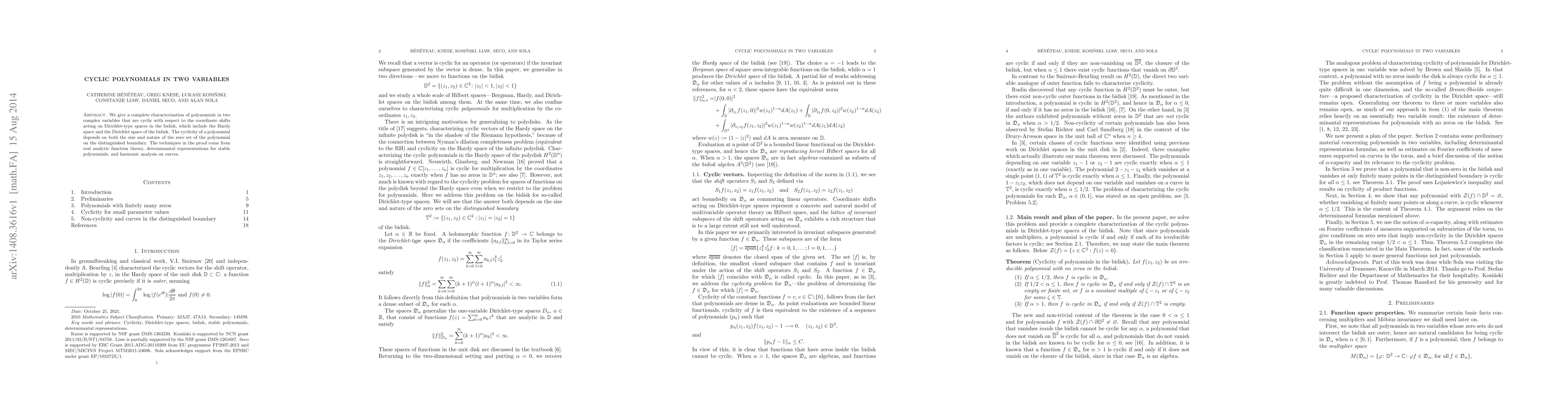 We give a complete characterization of polynomials in two complex variables that are cyclic with respect to the coordinate shifts acting on Dirichlet-type spaces in the bidisk, which include the Hardy space and the Dirichlet space of the bidisk. The cyclicity of a polynomial depends on both the size and nature of the zero set of the polynomial on the distinguished boundary. The techniques in the proof come from real analytic function theory, determinantal representations for stable polynomials, and harmonic analysis on curves
