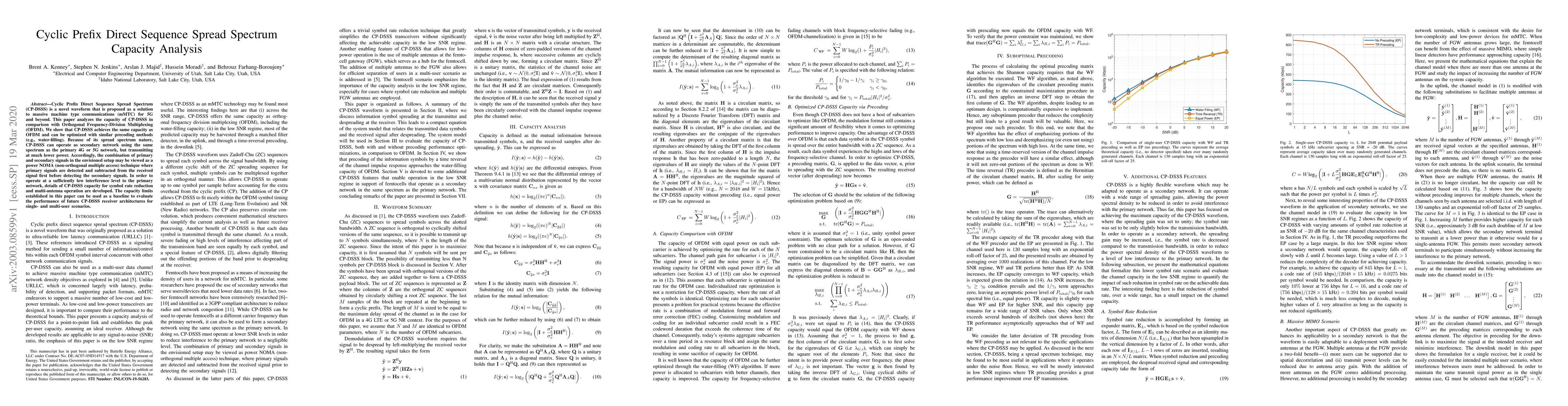 This paper analyzes the capacity of Cyclic Prefix Direct Sequence Spread Spectrum (CP-DSSS) for 5G and beyond, demonstrating it achieves similar capacity to OFDM while enabling lower power secondary network operations. The study also explores CP-DSSS's capacity limits for symbol rate reduction and multi-antenna setups, providing a baseline for future receiver architectures.