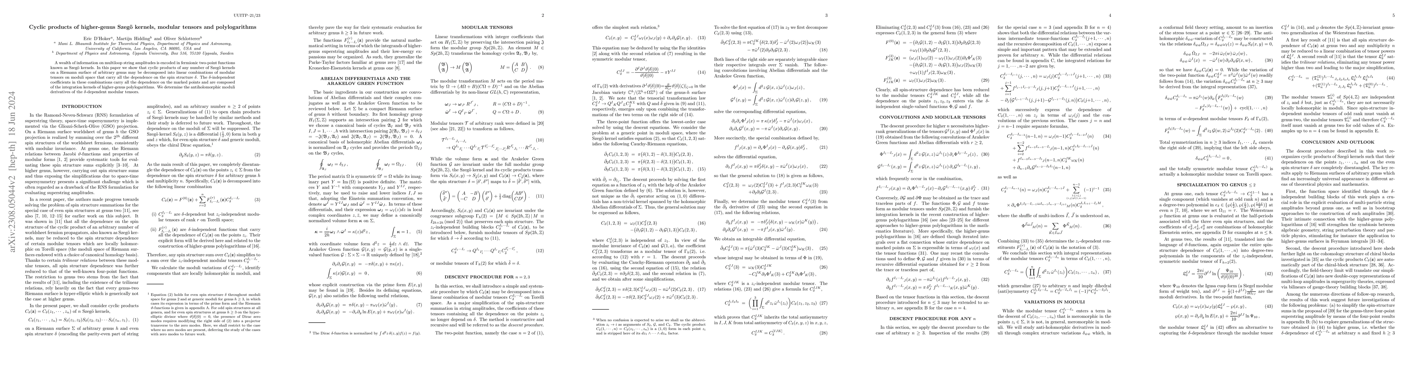 A wealth of information on multiloop string amplitudes is encoded in fermionic two-point functions known as Szeg\"o kernels. In this paper we show that cyclic products of any number of Szeg\"o kernels on a Riemann surface of arbitrary genus may be decomposed into linear combinations of modular tensors on moduli space that carry all the dependence on the spin structure $\delta$. The $\delta$-independent coefficients in these combinations carry all the dependence on the marked points and are composed of the integration kernels of higher-genus polylogarithms. We determine the antiholomorphic moduli derivatives of the $\delta$-dependent modular tensors.
