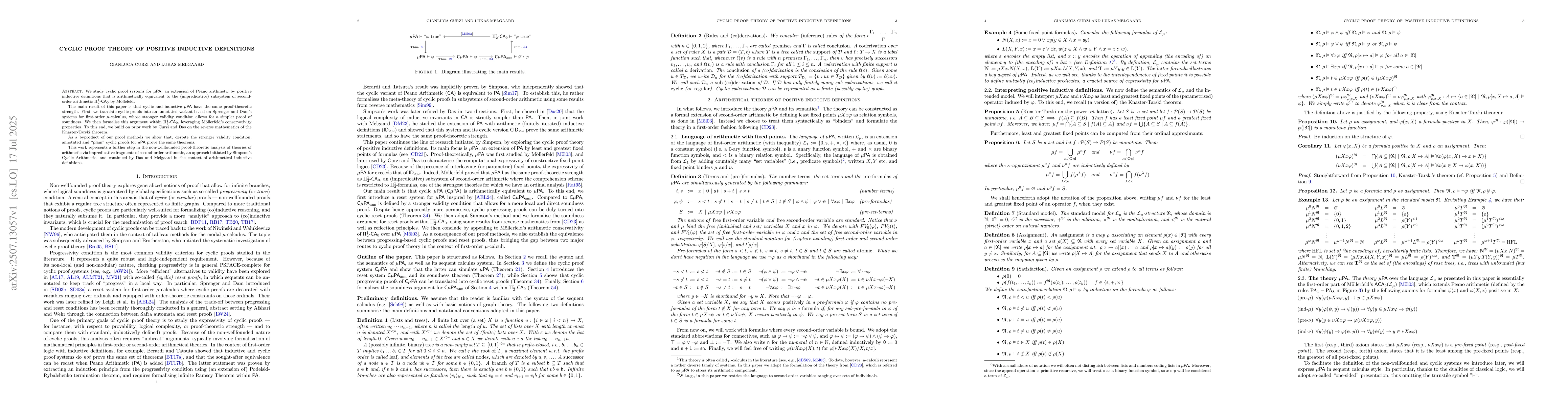 We study cyclic proof systems for $\mu\mathsf{PA}$, an extension of Peano arithmetic by positive inductive definitions that is arithmetically equivalent to the (impredicative) subsystem of second-order arithmetic $\Pi^1_2$-$\mathsf{CA}_0$ by M\"{o}llefeld. The main result of this paper is that cyclic and inductive $\mu\mathsf{PA}$ have the same proof-theoretic strength. First, we translate cyclic proofs into an annotated variant based on Sprenger and Dam's systems for first-order $\mu$-calculus, whose stronger validity condition allows for a simpler proof of soundness. We then formalise this argument within $\Pi^1_2$-$\mathsf{CA}_0$, leveraging M\"{o}llerfeld's conservativity properties. To this end, we build on prior work by Curzi and Das on the reverse mathematics of the Knaster-Tarski theorem. As a byproduct of our proof methods we show that, despite the stronger validity condition, annotated and "plain" cyclic proofs for $\mu\mathsf{PA}$ prove the same theorems. This work represents a further step in the non-wellfounded proof-theoretic analysis of theories of arithmetic via impredicative fragments of second-order arithmetic, an approach initiated by Simpson's Cyclic Arithmetic, and continued by Das and Melgaard in the context of arithmetical inductive definitions.