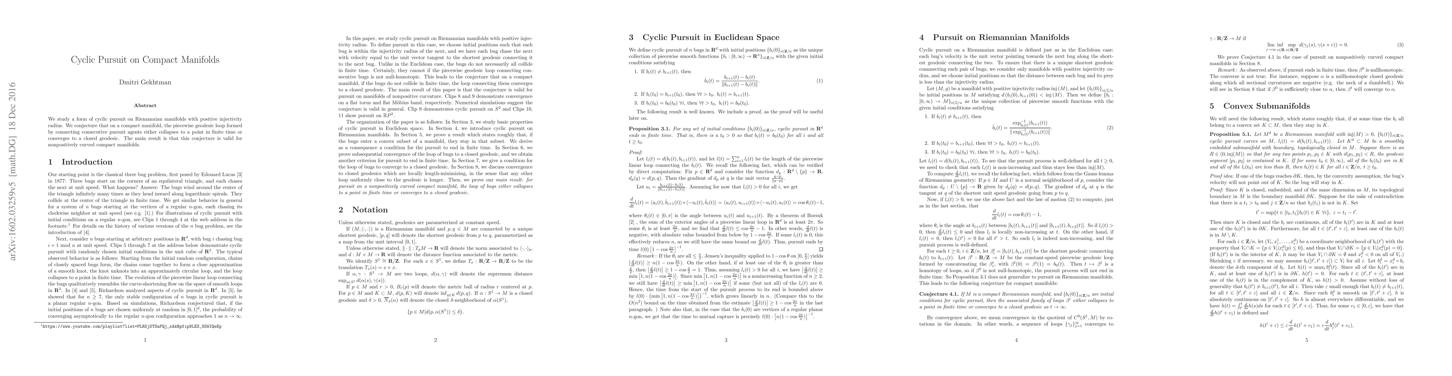 This paper investigates cyclic pursuit on Riemannian manifolds with positive injectivity radius, hypothesizing that on compact manifolds, the loop formed by pursuit agents either collapses or converges to a closed geodesic. The main finding supports this conjecture for nonpositively curved compact manifolds.