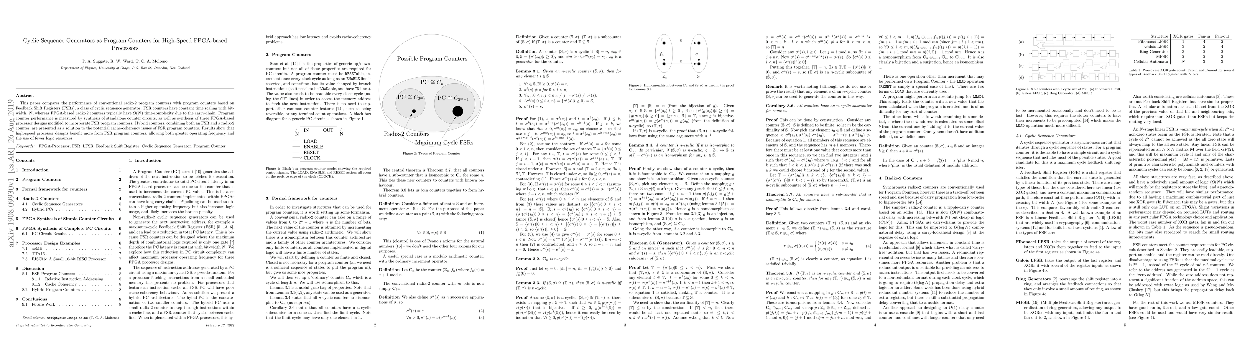 This paper evaluates the use of Feedback Shift Registers (FSRs) as cyclic sequence generators for program counters in high-speed FPGA-based processors, demonstrating their superior performance over conventional radix-2 counters due to constant time scaling. Hybrid counters combining FSRs and radix-2 counters address potential cache-coherency issues, showing enhanced operating frequency and reduced logic resource usage.