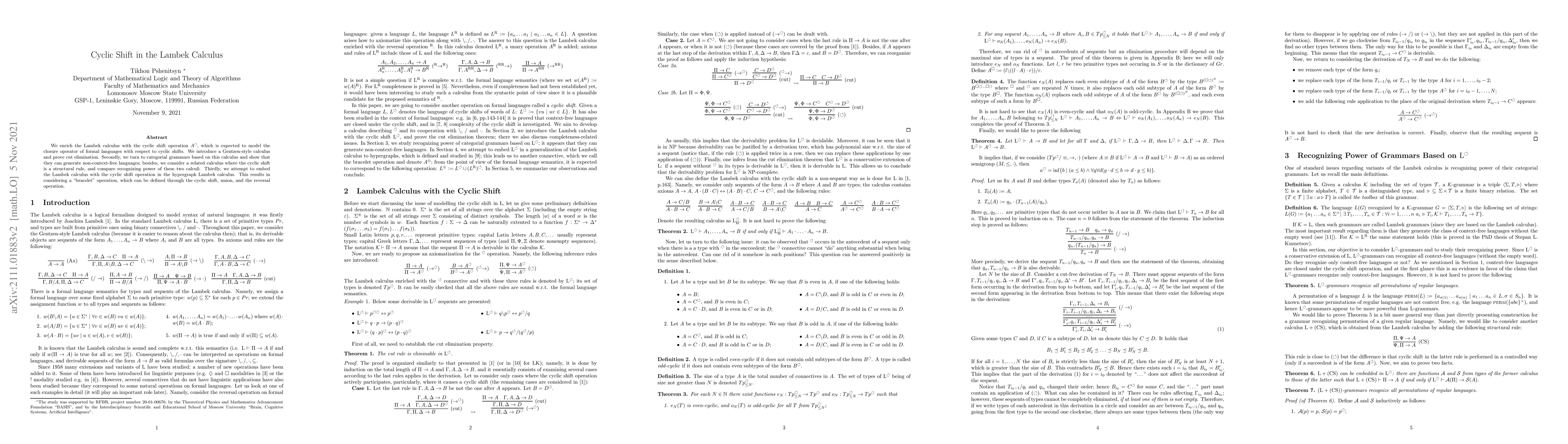 We enrich the Lambek calculus with the cyclic shift operation, which is expected to model the closure operator of formal languages with respect to cyclic shifts. We introduce a Gentzen-style calculus and prove cut elimination. Secondly, we turn to categorial grammars based on this calculus and show that they can generate non-context-free languages; besides, we consider a related calculus where the cyclic shift is a structural rule, and compare recognizing power of these two calculi. Thirdly, we attempt to embed the Lambek calculus with the cyclic shift operation in the hypergraph Lambek calculus. This results in considering a ``bracelet'' operation, which can be defined through the cyclic shift, union, and the reversal operation.