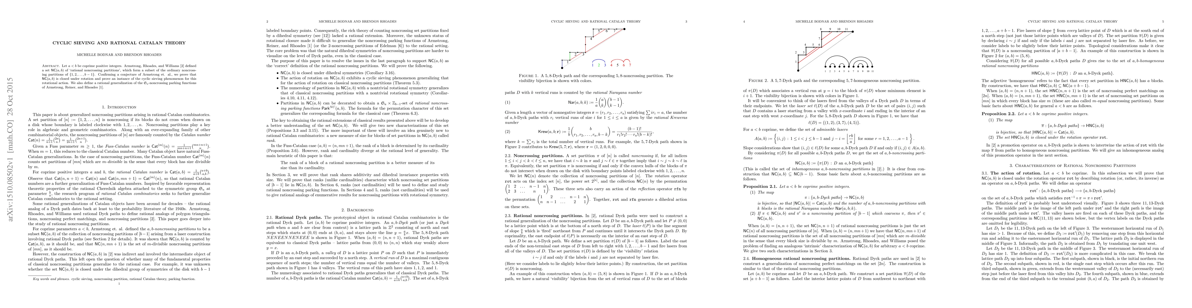 This paper confirms a conjecture about the set $\mathsf{NC}(a,b)$ of rational noncrossing partitions, proving its closure under rotation and demonstrating cyclic sieving phenomenon. It also introduces a rational generalization of $\mathfrak{S}_a$-noncrossing parking functions.