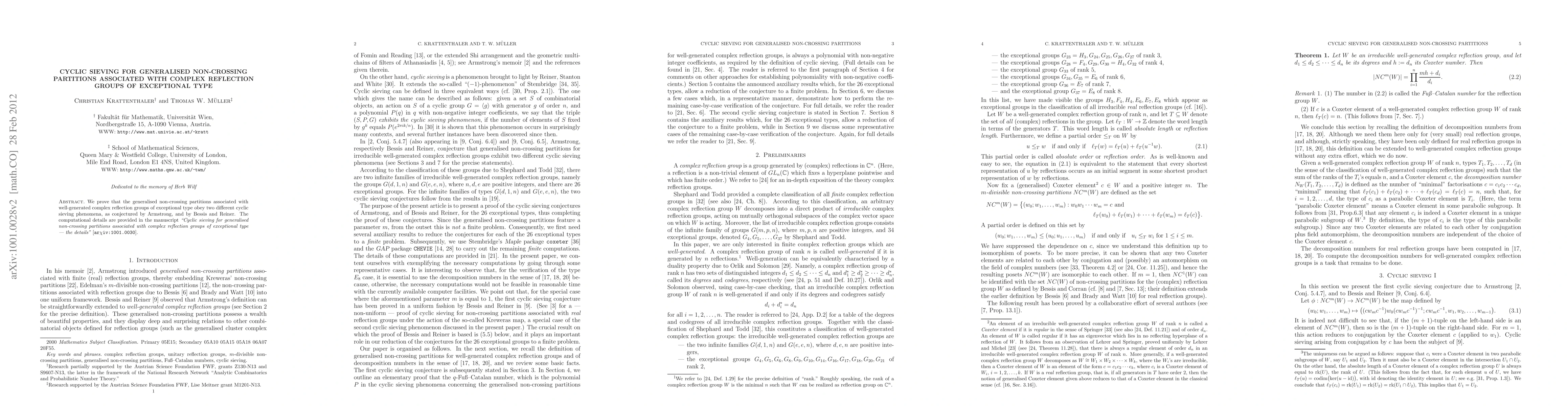 We present the proof of the cyclic sieving conjectures for generalised non-crossing partitions associated to well-generated complex reflection groups due to Armstrong, respectively to Bessis and Reiner, for the 26 exceptional well-generated complex reflection groups. The computational details are provided in the manuscript "Cyclic sieving for generalised non-crossing partitions associated to complex reflection groups of exceptional type - the details" [arXiv:1001.0030].