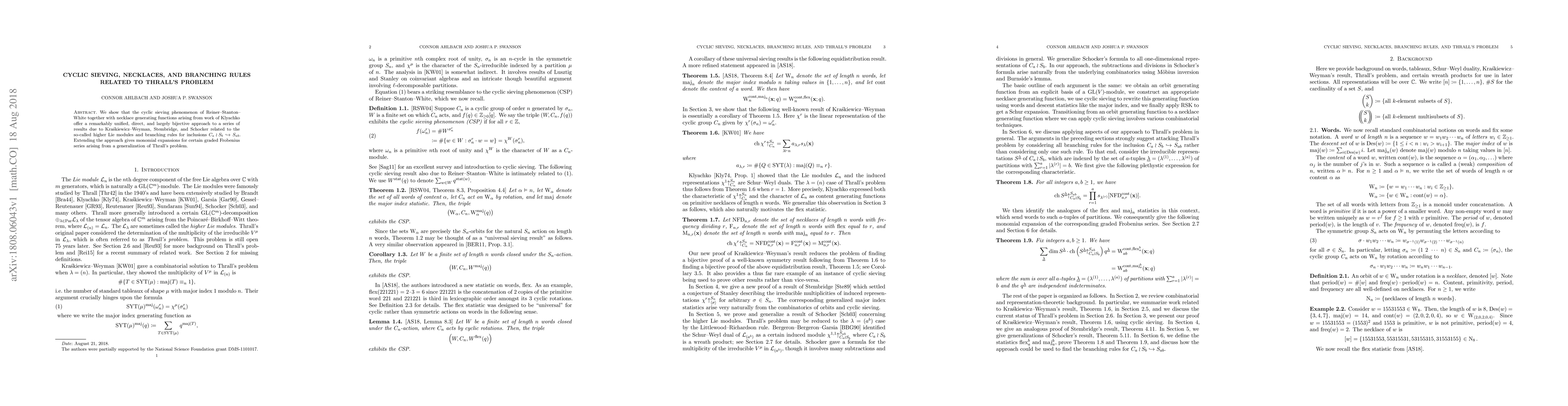 We show that the cyclic sieving phenomenon of Reiner--Stanton--White together with necklace generating functions arising from work of Klyachko offer a remarkably unified, direct, and largely bijective approach to a series of results due to Kraskiewicz--Weyman, Stembridge, and Schocker related to the so-called higher Lie modules and branching rules for inclusions $ C_a \wr S_b \hookrightarrow S_{ab} $. Extending the approach gives monomial expansions for certain graded Frobenius series arising from a generalization of Thrall's problem.