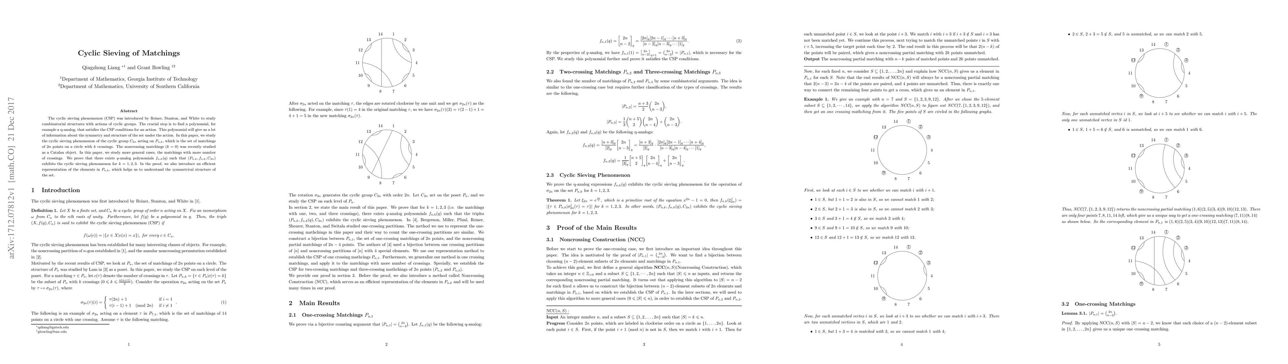 This paper investigates cyclic sieving phenomena for the cyclic group $C_{2n}$ acting on $P_{n,k}$, the set of matchings of $2n$ points with $k$ crossings. It proves the existence of $q$-analog polynomials $f_{n,k}(q)$ that exhibit cyclic sieving for $k=1,2,3$, and introduces an efficient representation to understand the symmetrical structure.