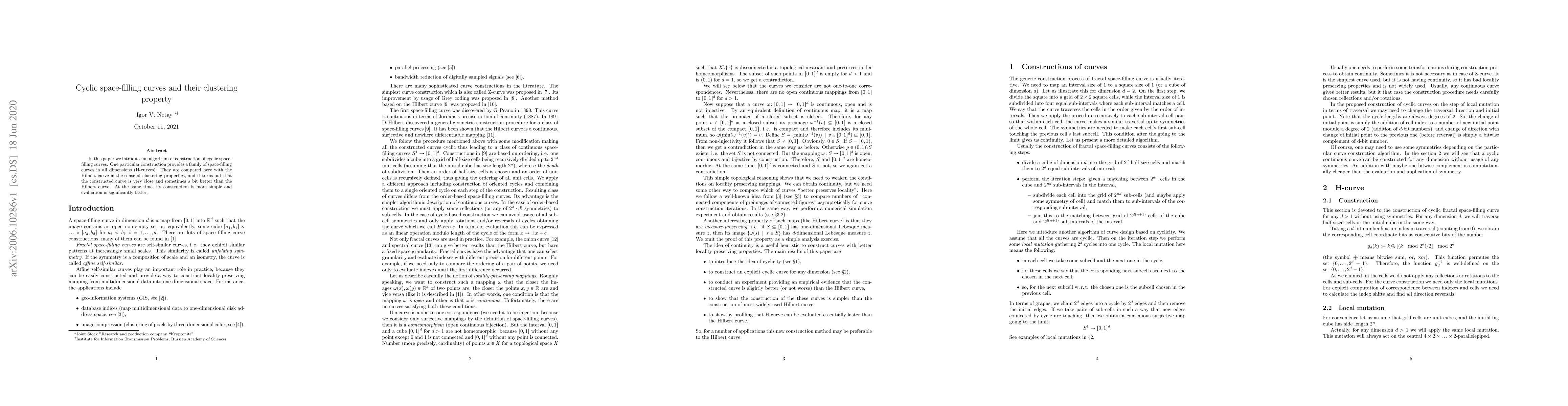 This paper presents an algorithm for constructing cyclic space-filling curves, specifically H-curves, which are simpler to build and evaluate faster than the Hilbert curve, while maintaining comparable clustering properties.