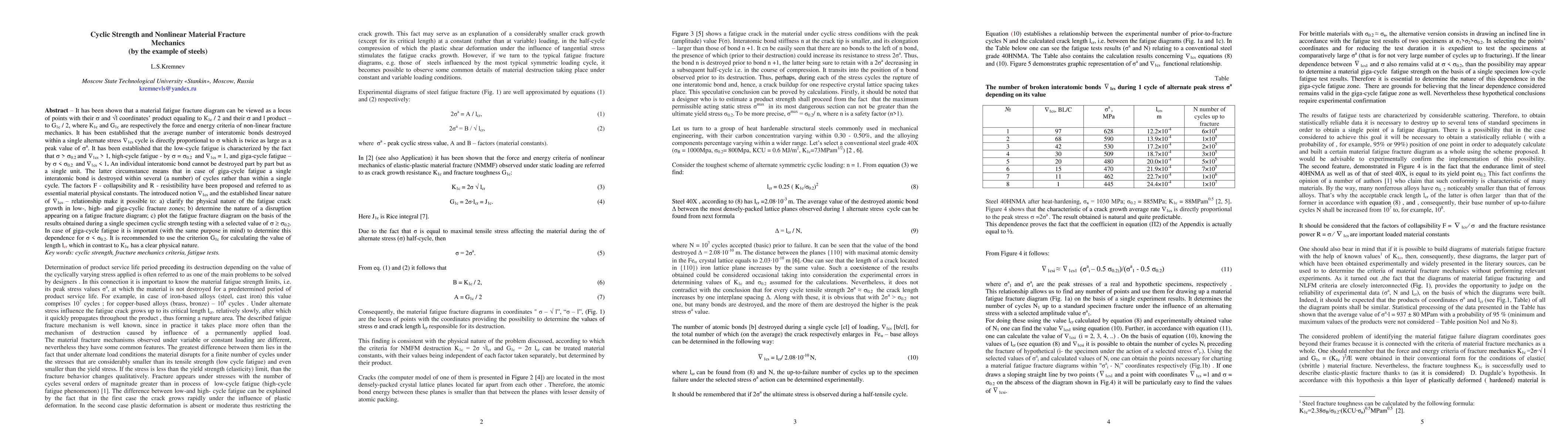 It was shown that a material fatigue fracture diagram can be viewed as a locus of points with $\sigma $ and $\sqrt l$ coordinates' product equal to $K_{1c}/2$, and $\sigma $ and $l$ product -- to $G_{1c}/2$, where $K_{1c}$ and $G_{1c}$ are non-linear fracture mechanics force and energy criteria. It was established that the average number of interatomic bonds destroyed within one alternate stress $\nabla_{1cs}$ cycle is directly proportional to $\sigma $ that is twice as large as a peak value of $\sigma^a$. It was found that low-cycle fatigue is characterized by $\sigma >\sigma_{0.2}$ and $\sigma_{1cs}> 1$, high-cycle fatigue -- by $\sigma = \sigma_{0.2}$ and $\nabla_{1cs} = 1$, and giga-cycle fatigue -- by $\sigma < \sigma_{0.2}$ and $\nabla_{1cs} < 1$. An individual interatomic bond cannot be destroyed part by part but as a single unit. The latter means that in giga-cycle fatigue a single interatomic bond is destroyed within several cycles rather than within a single cycle. The factors $F$ (collapsibility) and $R$ (resistibility) were proposed and mentioned as essential material physical constants. The introduced notion $\nabla_{1cs}$ and the established linear nature of $\nabla_{1cs}$ relationship allow to: a) clarify the fatigue crack growth physical nature in low-, high- and giga-cycle fracture zones; b) determine the nature of a fatigue fracture diagram disruption; c) plot the fatigue fracture diagram using the results obtained in a single specimen cyclic strength test with a selected value of $\sigma \ge \sigma_{0.2}$. For giga-cycle fatigue it is important (with similar purpose in mind) to determine this dependence for $\sigma < \sigma_{0.2}$. It is recommended to use $G_{1c}$ criterion to find the $l_{cr}$ length value which in contrast to $K_{1c}$ has a clear physical nature.