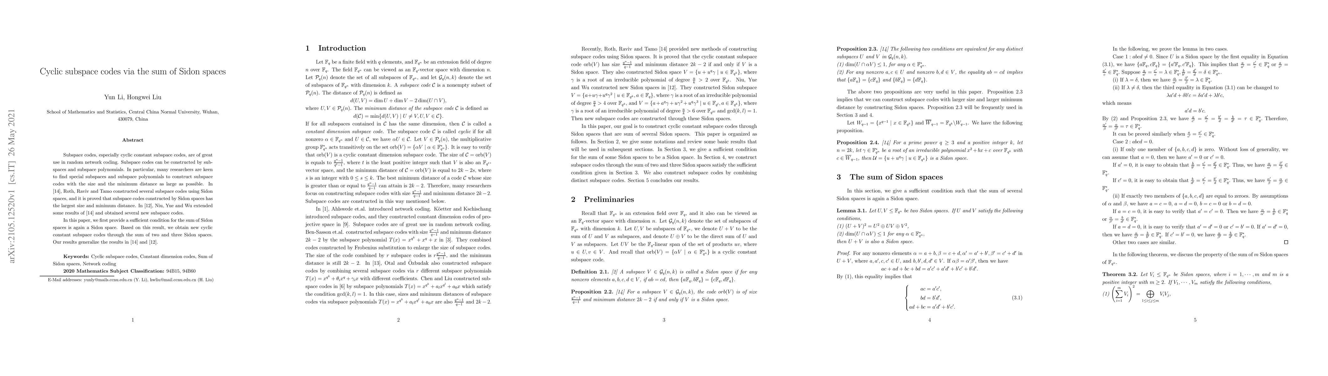 Subspace codes, especially cyclic constant subspace codes, are of great use in random network coding. Subspace codes can be constructed by subspaces and subspace polynomials. In particular, many researchers are keen to find special subspaces and subspace polynomials to construct subspace codes with the size and the minimum distance as large as possible. In [14], Roth, Raviv and Tamo constructed several subspace codes using Sidon spaces, and it is proved that subspace codes constructed by Sidon spaces has the largest size and minimum distance. In [12], Niu, Yue and Wu extended some results of [14] and obtained several new subspace codes. In this paper, we first provide a sufficient condition for the sum of Sidon spaces is again a Sidon space. Based on this result, we obtain new cyclic constant subspace codes through the sum of two and three Sidon spaces. Our results generalize the results in [14] and [12].