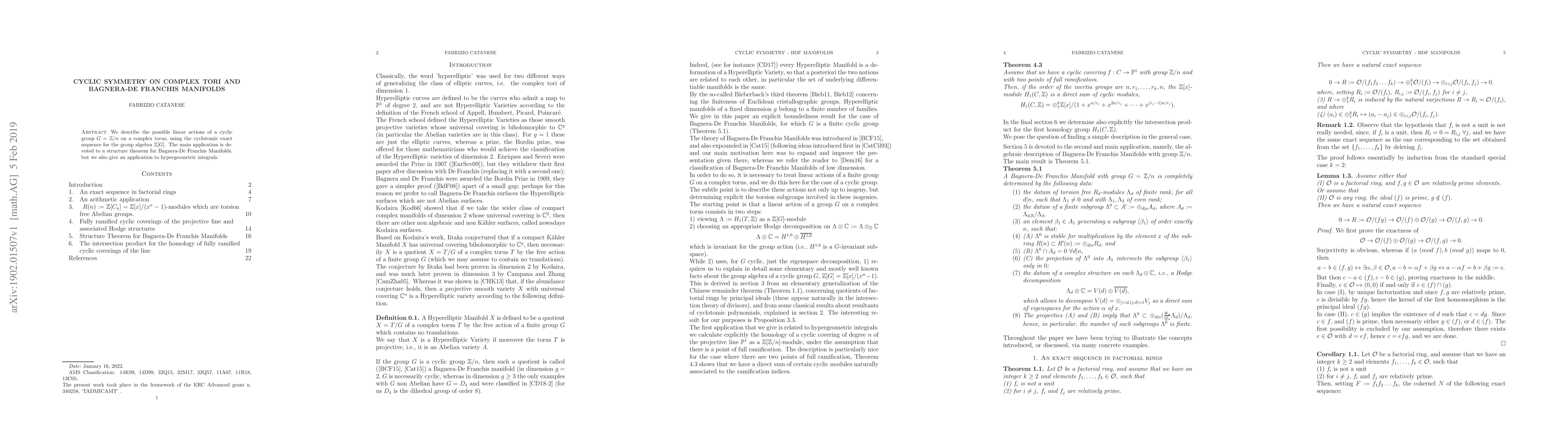 We describe the possible linear actions of a cyclic group $G = \mathbb{Z} /n$ on a complex torus, using the cyclotomic exact sequence for the group algebra $\mathbb{Z} [G]$. The main application is devoted to a structure theorem for Bagnera-De Franchis Manifolds, but we also give an application to hypergeometric integrals.