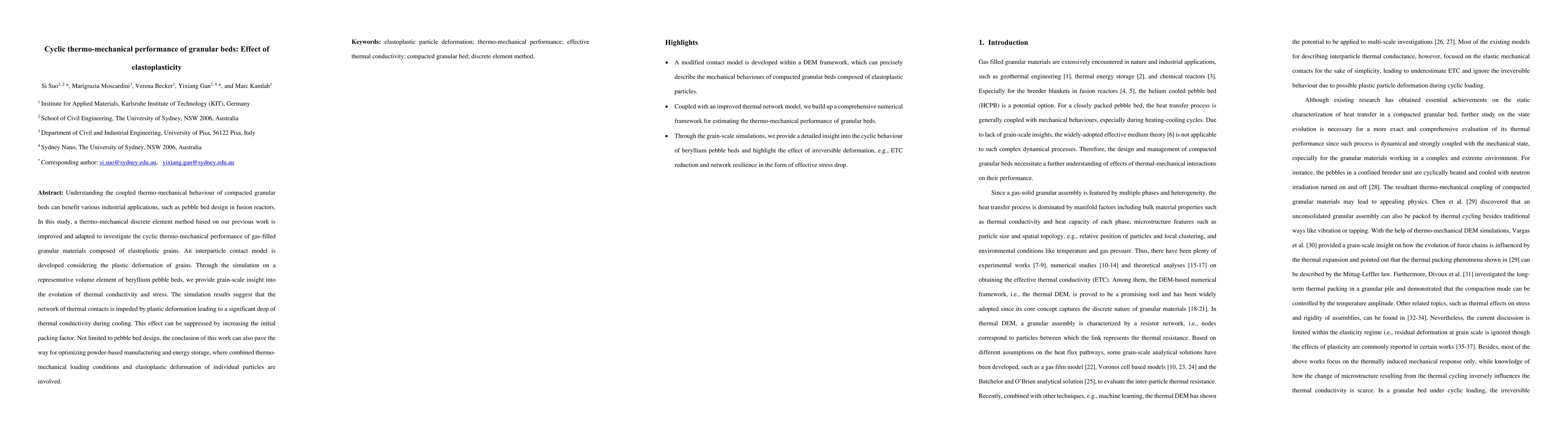 This paper investigates the cyclic thermo-mechanical performance of gas-filled granular beds using a discrete element method, focusing on the elastoplastic behavior of grains. The study finds that plastic deformation reduces thermal conductivity, an effect mitigated by higher initial packing factors.