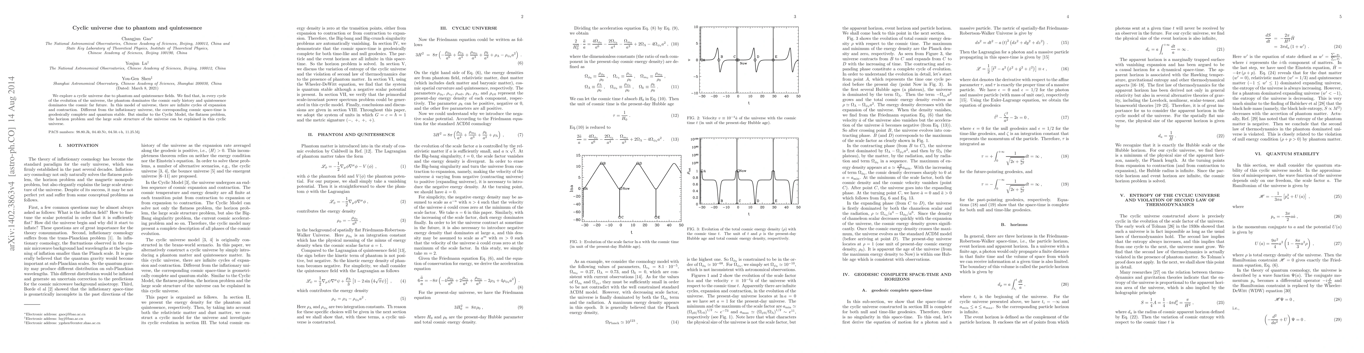 This paper proposes a cyclic universe model driven by phantom and quintessence fields, where phantom dominates the early cycles and quintessence the far future, leading to infinite cycles of expansion and contraction. Unlike inflationary models, this cyclic universe is geodesically complete and quantum stable, while still resolving the flatness, horizon, and large-scale structure problems.